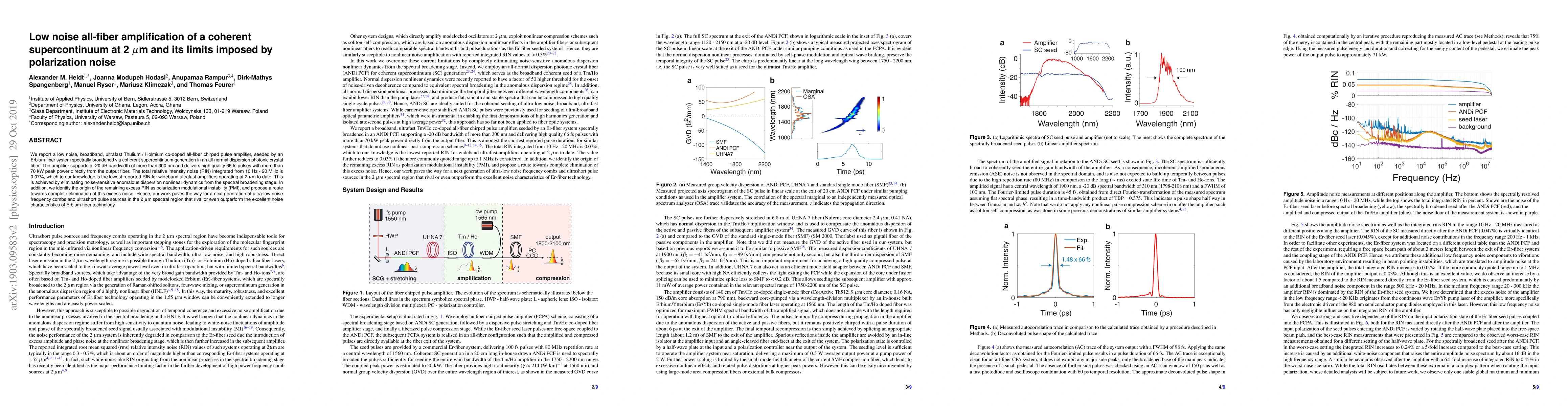 This paper presents an all-fiber amplification system for a coherent supercontinuum at 2 µm, achieving high-quality 66 fs pulses with over 70 kW peak power. The system's noise characteristics are excellent due to coherent seeding and stable dynamics, but are limited by polarization noise.