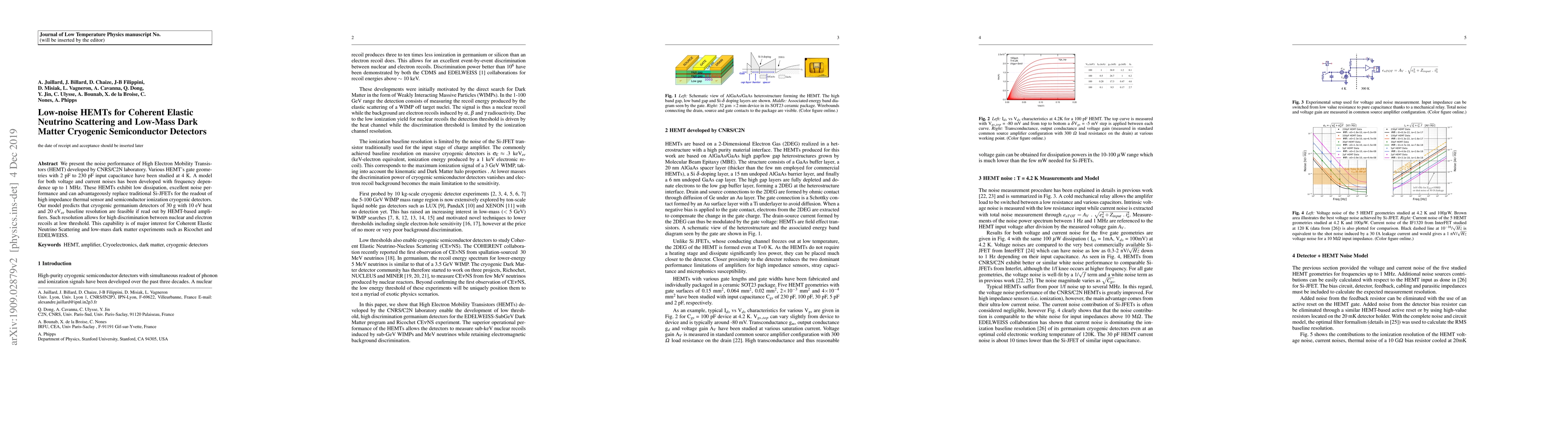 This paper reports on the noise performance of High Electron Mobility Transistors (HEMTs) developed for cryogenic semiconductor detectors, showing low dissipation and excellent noise performance. The HEMTs, with gate geometries ranging from 2 pF to 230 pF, are proposed as superior alternatives to traditional Si-JFETs for high impedance thermal sensors, enabling feasible 30 g germanium detectors with 10 eV heat and 20 eVee resolution for Coherent Elastic Neutrino Scattering and low-mass dark matter experiments.