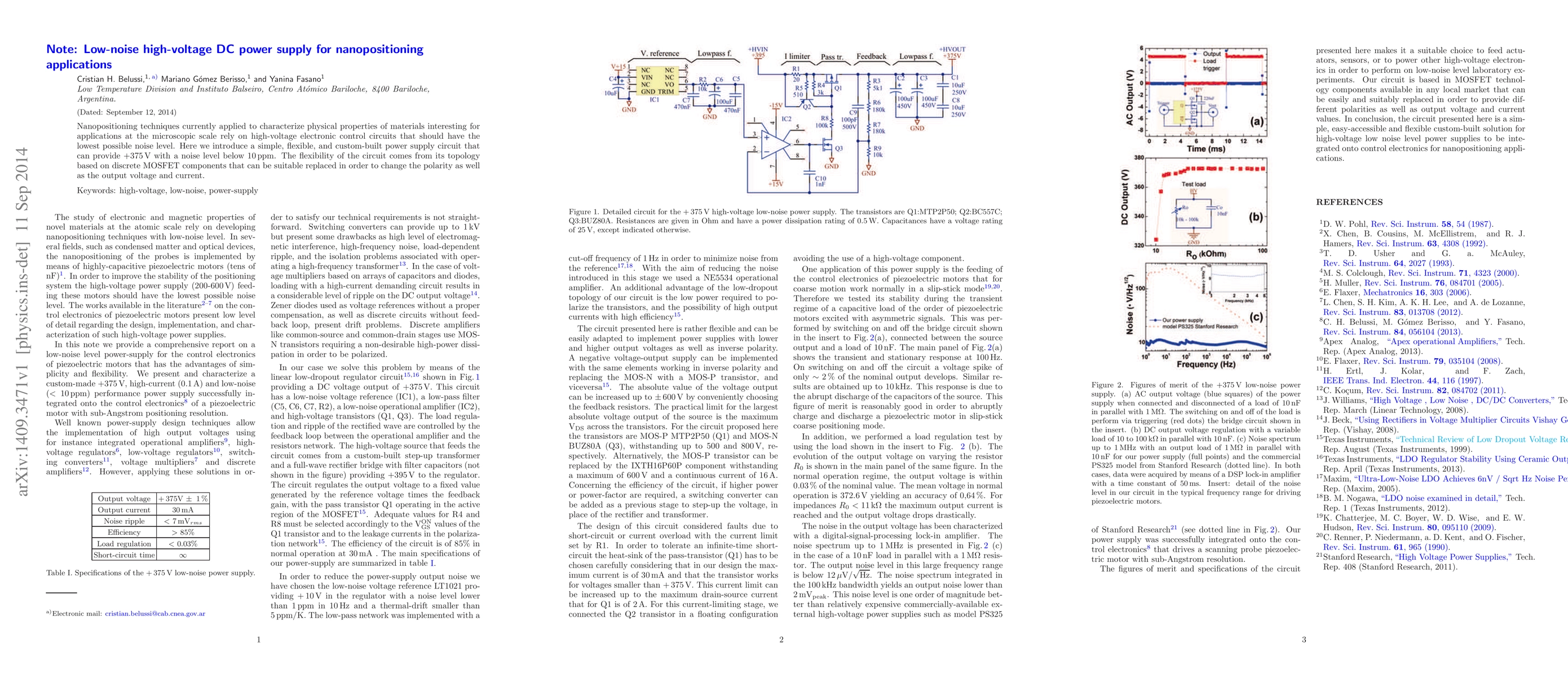 Nanopositioning techniques currently applied to characterize physical properties of materials interesting for applications at the microscopic scale rely on high-voltage electronic control circuits that should have the lowest possible noise level. Here we introduce a simple, flexible, and custom-built power supply circuit that can provide +375\,V with a noise level below 10\,ppm. The flexibility of the circuit comes from its topology based on discrete MOSFET components that can be suitable replaced in order to change the polarity as well as the output voltage and current.
