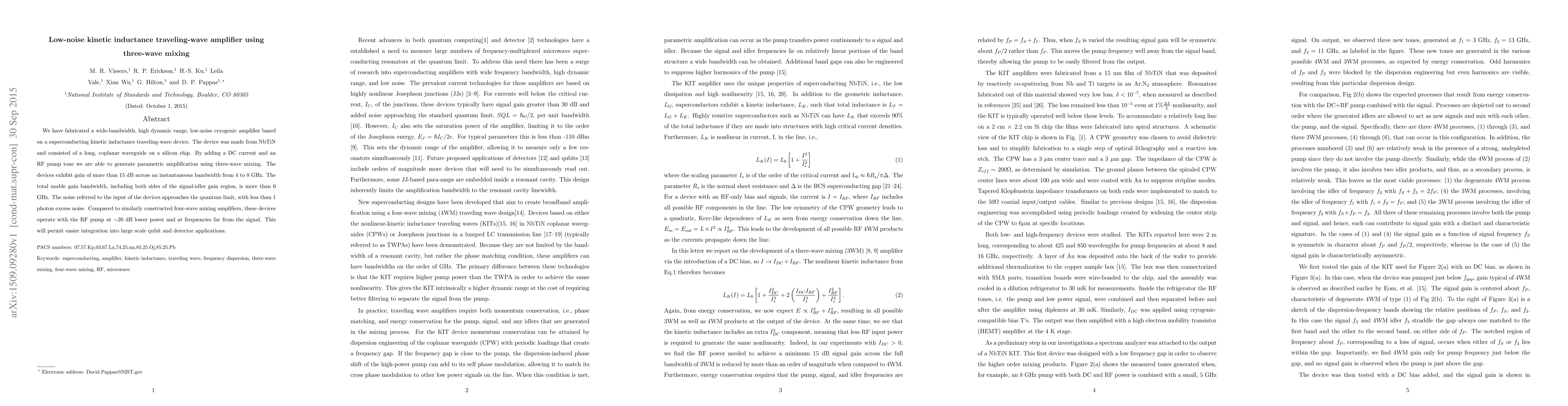 This paper presents a low-noise cryogenic amplifier based on a superconducting kinetic inductance traveling-wave device, achieving gain of over 15 dB across a 6 GHz bandwidth. The device utilizes three-wave mixing for parametric amplification at lower RF pump power compared to four-wave mixing counterparts.