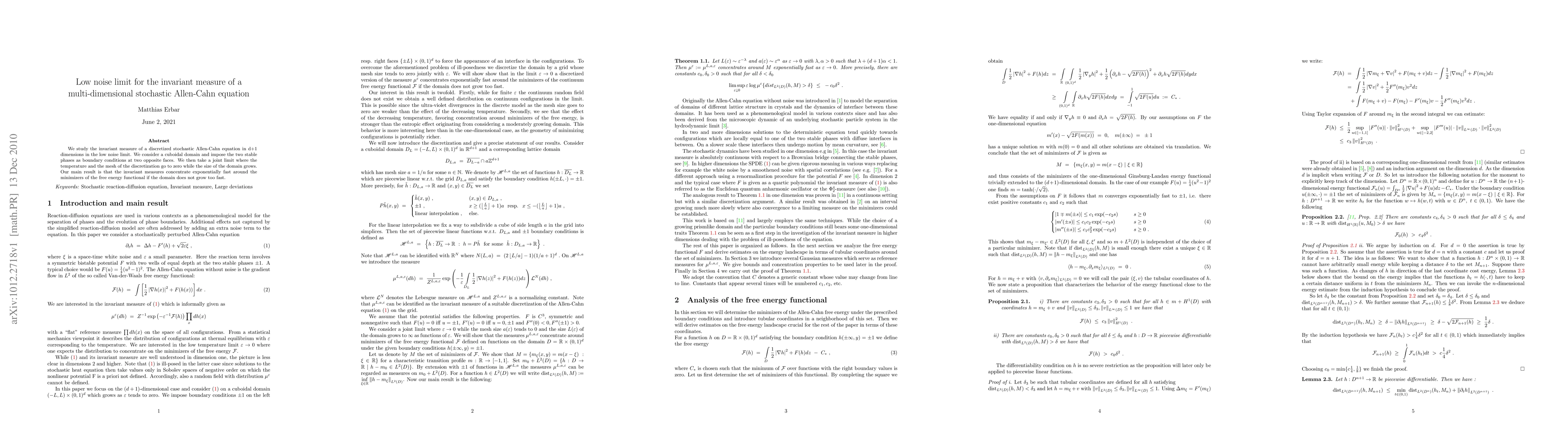 This paper investigates the invariant measure of a stochastic Allen-Cahn equation in low noise conditions, focusing on a discretized version in d+1 dimensions. The authors demonstrate that the invariant measures concentrate rapidly around the free energy functional's minimizers, provided the domain size does not increase too quickly.