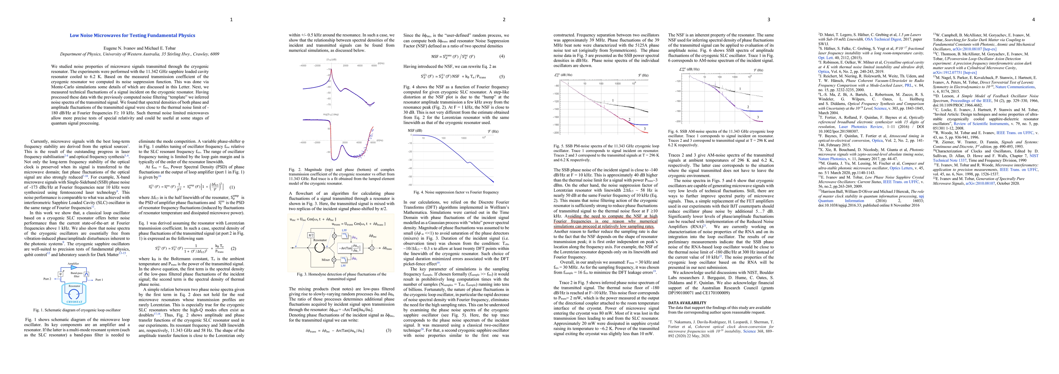 The paper details the study of noise properties in microwave signals through a cryogenic resonator cooled to 6.2K. Utilizing Monte-Carlo simulations, they computed the noise suppression function and found that both phase and amplitude fluctuation spectral densies of the transmitted signal approached the thermal noise limit of -180 dB/Hz at frequencies above 10 kHz. This advancement could enhance precision in testing special relativity and benefit quantum signal processing stages.