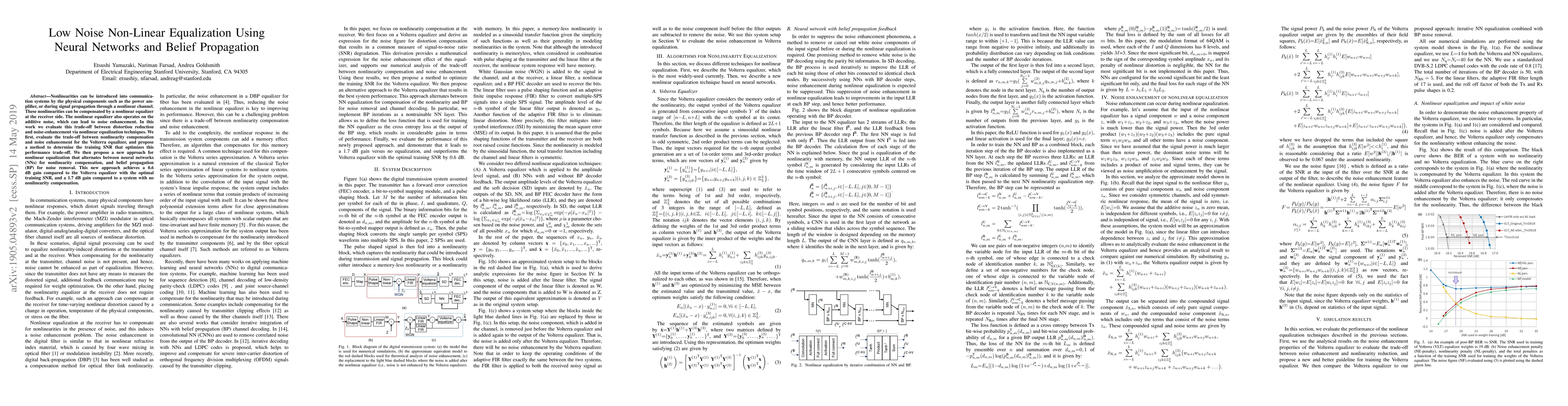 This paper proposes a novel nonlinear equalization method combining neural networks for nonlinearity compensation and belief propagation for noise removal, achieving significant gains in performance over traditional Volterra equalizers and systems without nonlinearity compensation. The approach optimizes the trade-off between distortion reduction and noise enhancement.