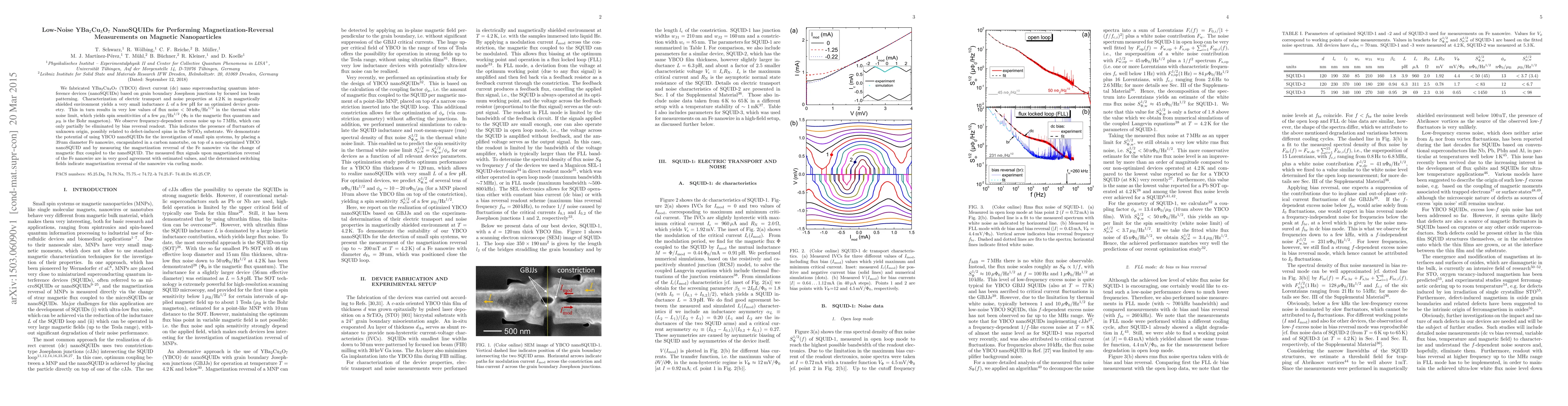 This paper reports the fabrication of low-noise YBa$_2$Cu$_3$O$_7$ (YBCO) nanoSQUIDs for precise magnetization-reversal measurements on magnetic nanoparticles. The optimized devices exhibit low inductance and flux noise, enabling the detection of small spin systems, as demonstrated by successful magnetization reversal measurements on a Fe nanowire encapsulated in a carbon nanotube.