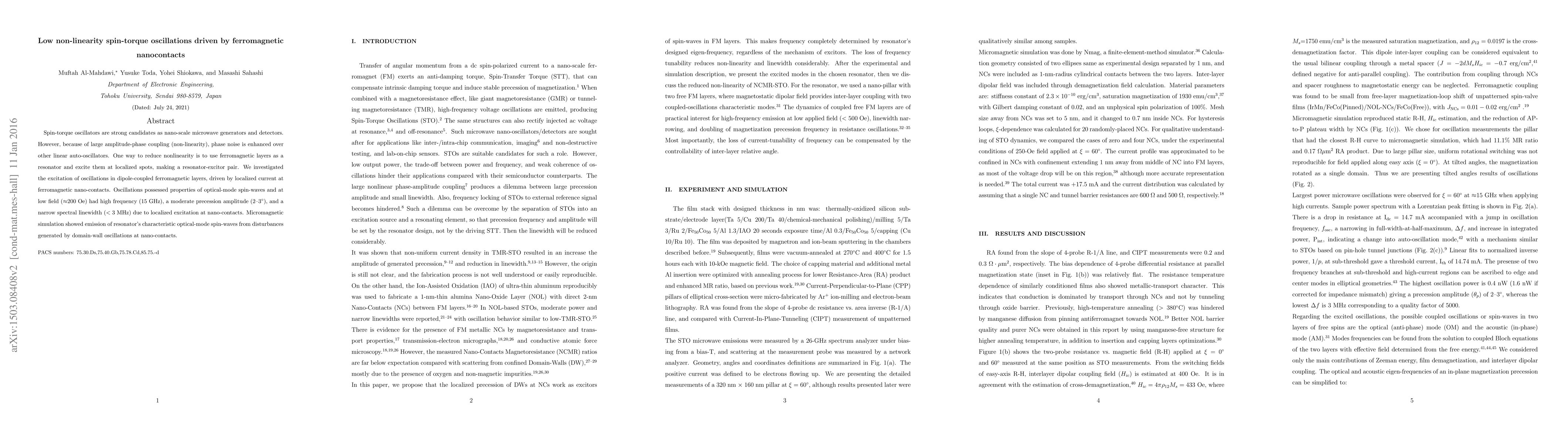 This paper investigates low-non-linearity spin-torque oscillations in ferromagnetic nanocontacts, demonstrating high-frequency (15 GHz) microwave generation with minimal phase noise due to localized excitation and moderate precession amplitude (2-3°). Micromagnetic simulations confirm the emission of optical-mode spin-waves from domain-wall oscillations at nano-contacts.