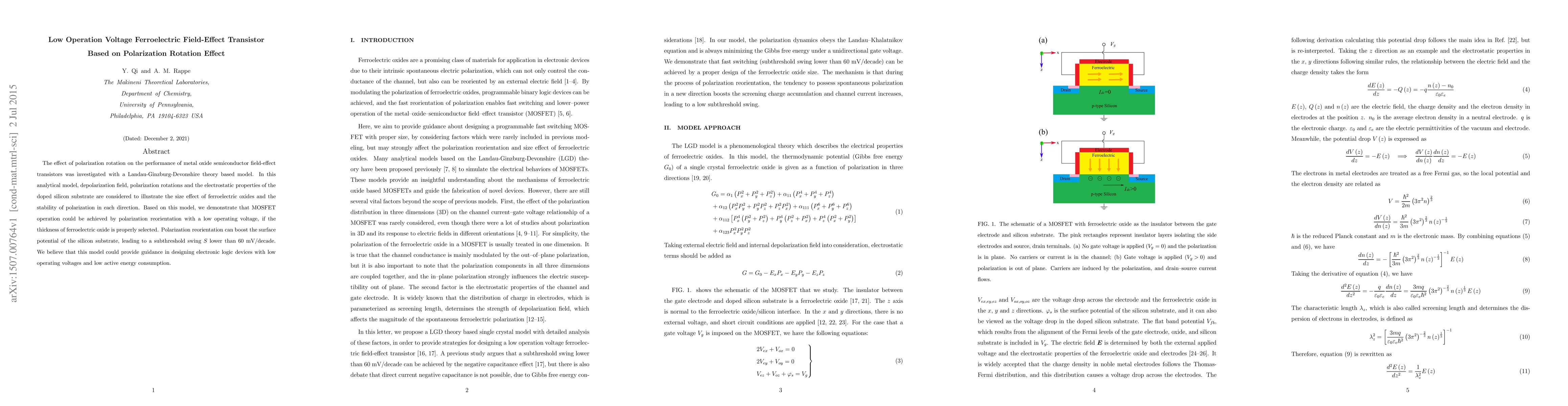This paper investigates the polarization rotation effect in metal oxide semiconductor field-effect transistors using a Landau-Ginzburg-Devonshire theory model, demonstrating that low operation voltages can be achieved through ferroelectric oxide thickness optimization, potentially leading to low-energy electronic devices. The model shows that polarization reorientation can significantly reduce subthreshold swing, enhancing device performance.