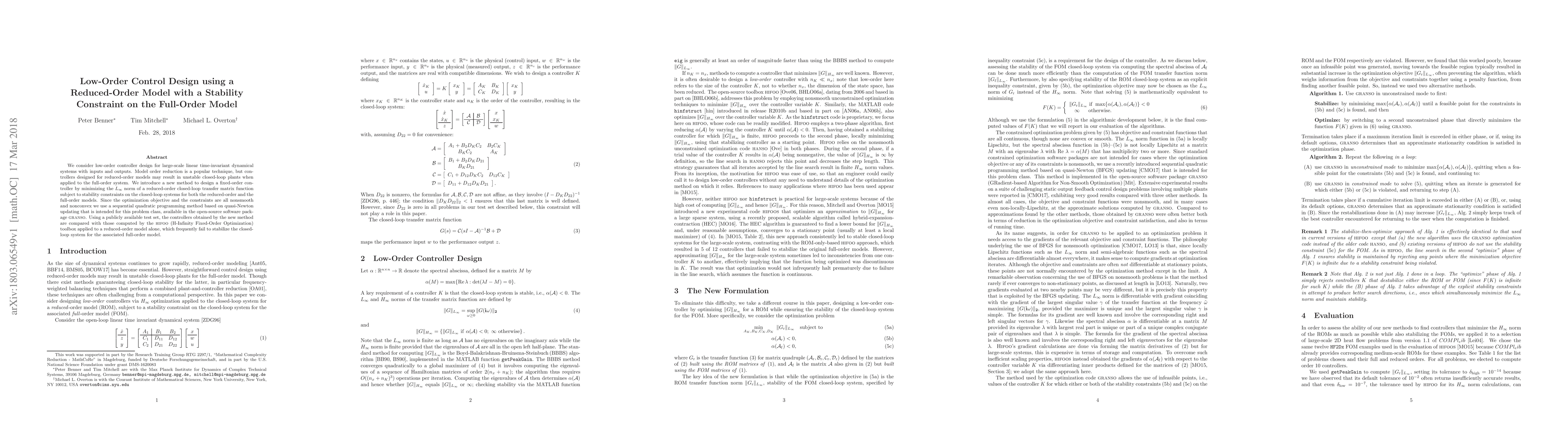 We consider low-order controller design for large-scale linear time-invariant dynamical systems with inputs and outputs. Model order reduction is a popular technique, but controllers designed for reduced-order models may result in unstable closed-loop plants when applied to the full-order system. We introduce a new method to design a fixed-order controller by minimizing the $L_\infty$ norm of a reduced-order closed-loop transfer matrix function subject to stability constraints on the closed-loop systems for both the reduced-order and the full-order models. Since the optimization objective and the constraints are all nonsmooth and nonconvex we use a sequential quadratic programming method based on quasi-Newton updating that is intended for this problem class, available in the open-source software package GRANSO. Using a publicly available test set, the controllers obtained by the new method are compared with those computed by the HIFOO (H-Infinity Fixed-Order Optimization) toolbox applied to a reduced-order model alone, which frequently fail to stabilize the closed-loop system for the associated full-order model.