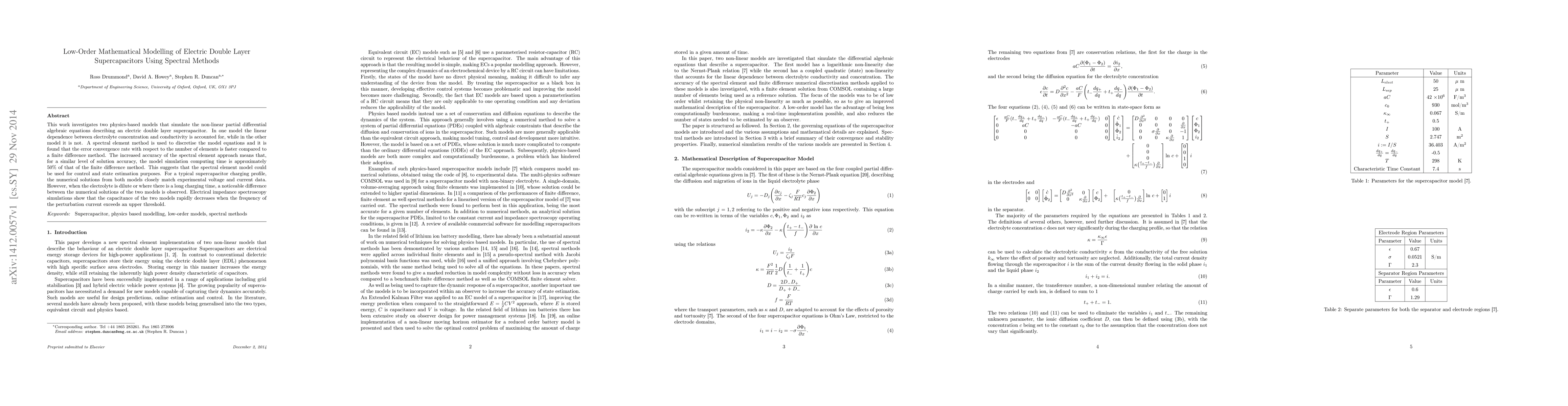 This work investigates two physics-based models that simulate the non-linear partial differential algebraic equations describing an electric double layer supercapacitor. In one model the linear dependence between electrolyte concentration and conductivity is accounted for, while in the other model it is not. A spectral element method is used to discretise the model equations and it is found that the error convergence rate with respect to the number of elements is faster compared to a finite difference method. The increased accuracy of the spectral element approach means that, for a similar level of solution accuracy, the model simulation computing time is approximately 50% of that of the finite difference method. This suggests that the spectral element model could be used for control and state estimation purposes. For a typical supercapacitor charging profile, the numerical solutions from both models closely match experimental voltage and current data. However, when the electrolyte is dilute or where there is a long charging time, a noticeable difference between the numerical solutions of the two models is observed. Electrical impedance spectroscopy simulations show that the capacitance of the two models rapidly decreases when the frequency of the perturbation current exceeds an upper threshold.