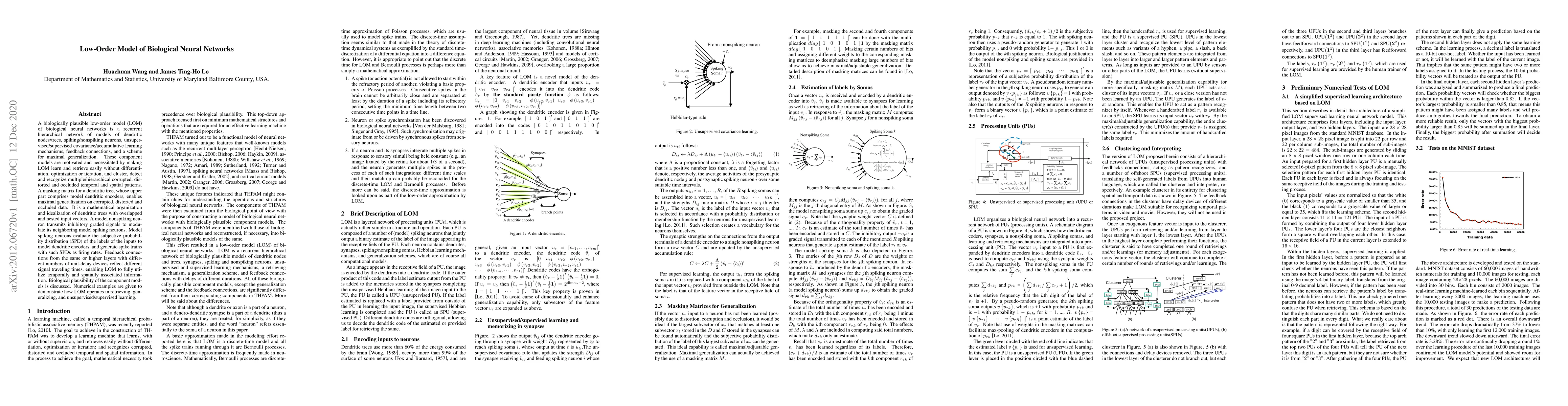 A biologically plausible low-order model (LOM) of biological neural networks is a recurrent hierarchical network of dendritic nodes/trees, spiking/nonspiking neurons, unsupervised/ supervised covariance/accumulative learning mechanisms, feedback connections, and a scheme for maximal generalization. These component models are motivated and necessitated by making LOM learn and retrieve easily without differentiation, optimization, or iteration, and cluster, detect and recognize multiple/hierarchical corrupted, distorted, and occluded temporal and spatial patterns.