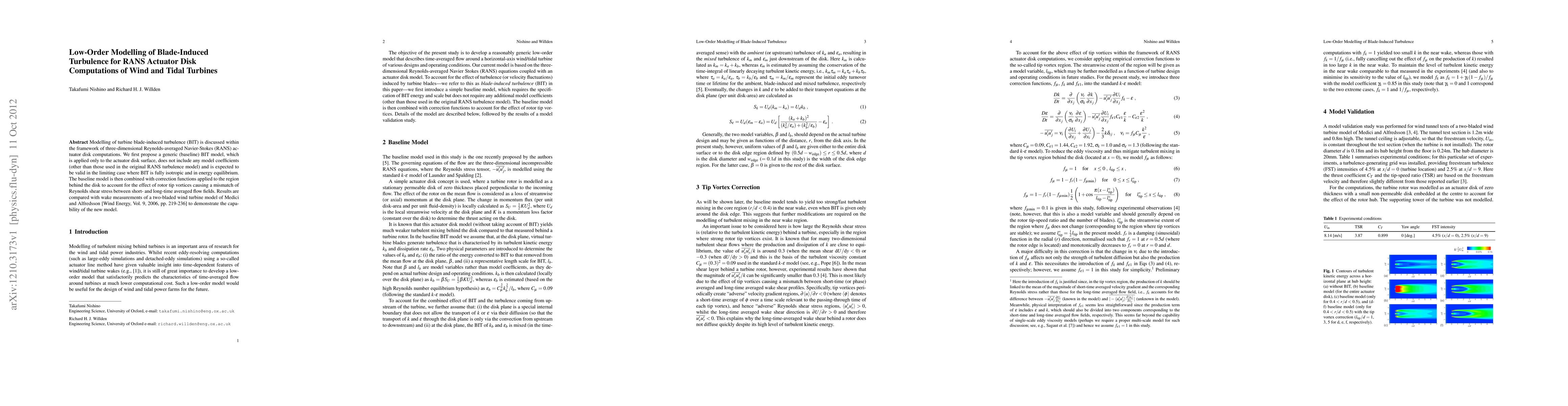 This paper proposes a low-order turbulence model for blade-induced turbulence (BIT) in RANS actuator disk computations for wind and tidal turbines. The model, combined with correction functions, aims to address the effects of rotor tip vortices and is validated against experimental wake measurements from a wind turbine study.
