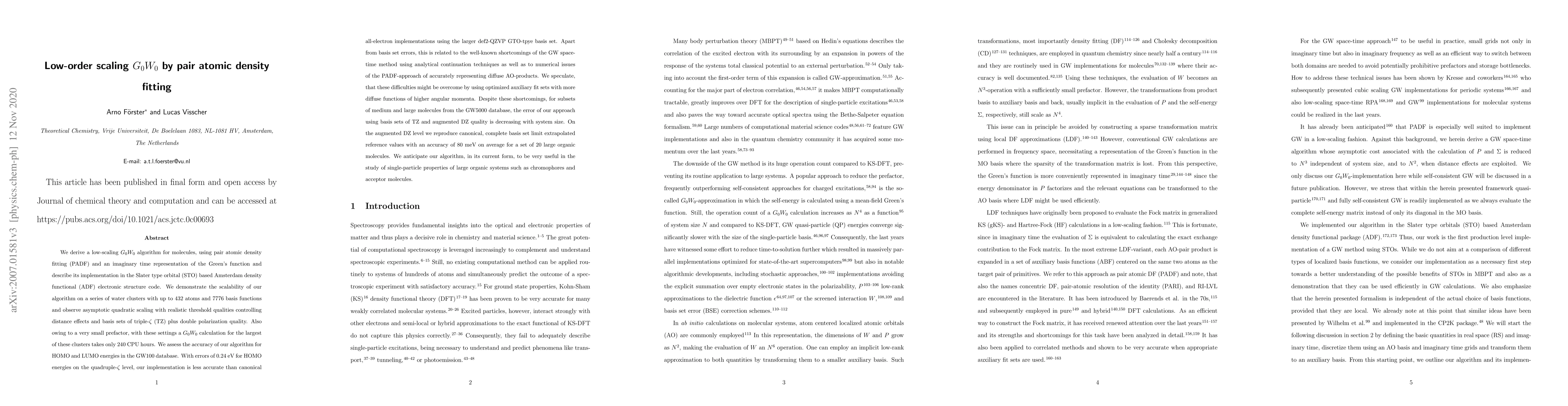 We derive a low-scaling $G_0W_0$ algorithm for molecules, using pair atomic density fitting (PADF) and an imaginary time representation of the Green's function and describe its implementation in the Slater type orbital (STO) based Amsterdam density functional (ADF) electronic structure code. We demonstrate the scalability of our algorithm on a series of water clusters with up to 432 atoms and 7776 basis functions and observe asymptotic quadratic scaling with realistic threshold qualities controlling distance effects and basis sets of triple-$\zeta$ (TZ) plus double polarization quality. Also owing to a very small prefactor, with these settings a $G_0W_0$ calculation for the largest of these clusters takes only 240 CPU hours. With errors of 0.24 eV for HOMO energies in the GW100 database on the quadruple-$\zeta$ level, our implementation is less accurate than canonical all-electron implementations using the larger def2-QZVP GTO-tpye basis set. Apart from basis set errors, this is related to the well-known shortcomings of the GW space-time method using analytical continuation techniques as well as to numerical issues of the PADF-approach of accurately representing diffuse AO-products. We speculate, that these difficulties might be overcome by using optimized auxiliary fit sets with more diffuse functions of higher angular momenta. Despite these shortcomings, for subsets of medium and large molecules from the GW5000 database, the error of our approach using basis sets of TZ and augmented DZ quality is decreasing with system size. On the augmented DZ level we reproduce canonical, complete basis set limit extrapolated reference values with an accuracy of 80 meV on average for a set of 20 large organic molecules. We anticipate our algorithm, in its current form, to be very useful in the study of single-particle properties of large organic systems such as chromophores and acceptor molecules.