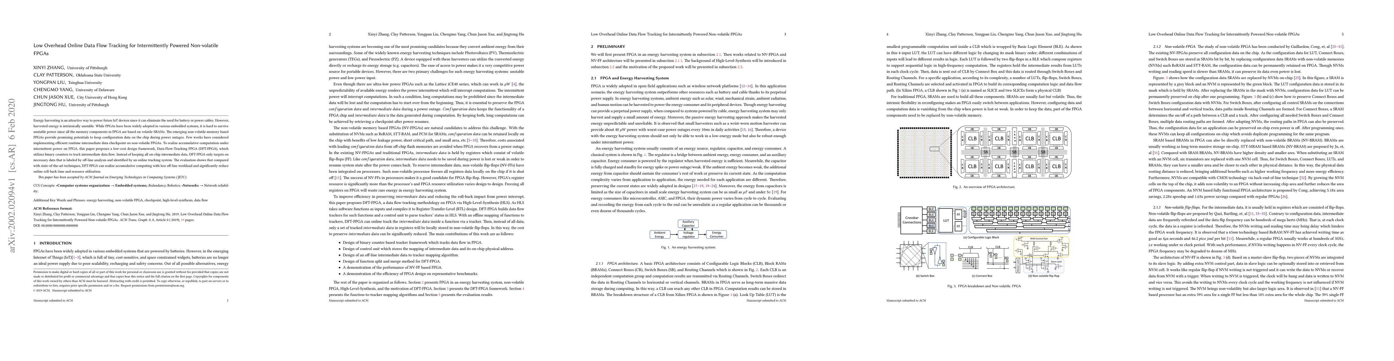 This paper proposes a low-cost design framework called Data-Flow-Tracking FPGA (DFT-FPGA) to enable accumulative computation on intermittently powered non-volatile FPGAs by tracking only necessary intermediate data using binary counters, achieving reduced roll-back time and resource utilization compared to existing methods.