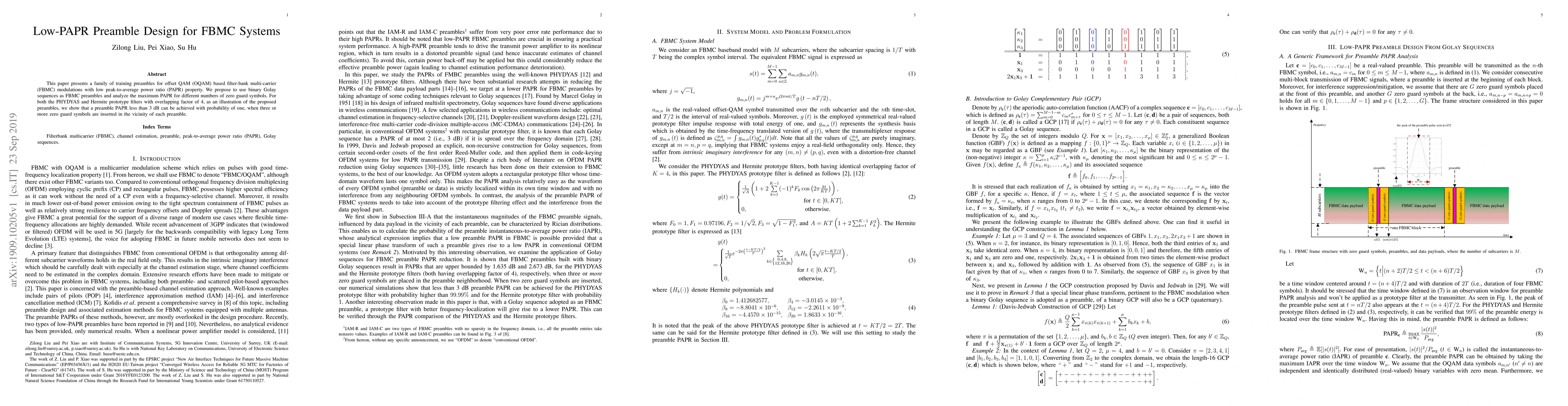 This paper proposes low-PAPR training preambles for FBMC systems using binary Golay sequences, achieving a preamble PAPR below 3 dB with high probability by inserting three or more zero guard symbols. The effectiveness is demonstrated for both PHYDYAS and Hermite prototype filters.