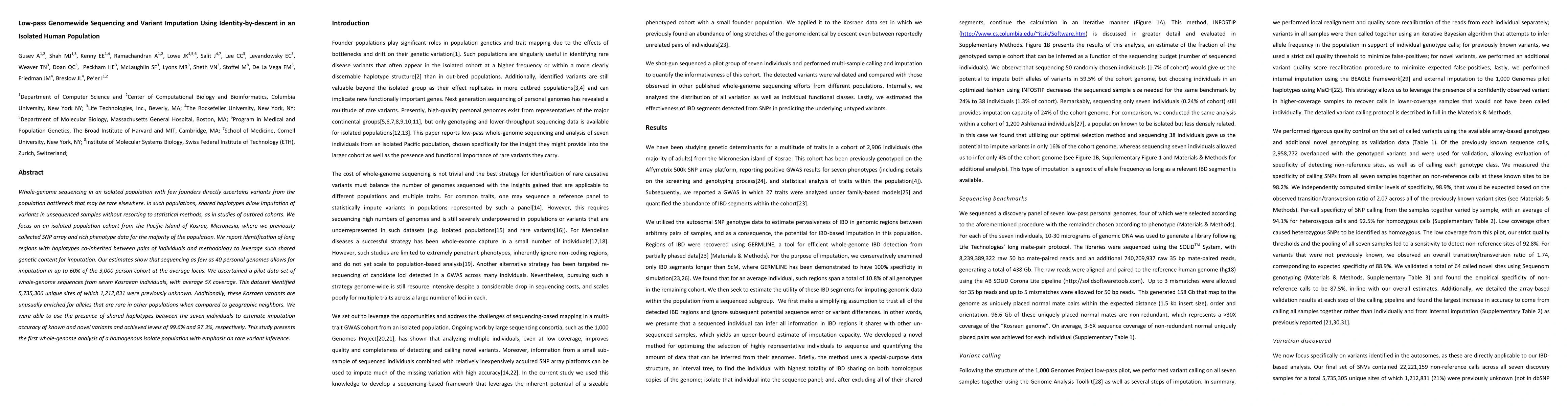 Whole-genome sequencing in an isolated population with few founders directly ascertains variants from the population bottleneck that may be rare elsewhere. In such populations, shared haplotypes allow imputation of variants in unsequenced samples without resorting to statistical methods, as in studies of outbred cohorts. We focus on an isolated population cohort from the Pacific Island of Kosrae, Micronesia, where we previously collected SNP array and rich phenotype data for the majority of the population. We report identification of long regions with haplotypes co-inherited between pairs of individuals and methodology to leverage such shared genetic content for imputation. Our estimates show that sequencing as few as 40 personal genomes allows for imputation in up to 60% of the 3,000-person cohort at the average locus. We ascertained a pilot data-set of whole-genome sequences from seven Kosraean individuals, with average 5X coverage. This dataset identified 5,735,306 unique sites of which 1,212,831 were previously unknown. Additionally, these Kosraen variants are unusually enriched for alleles that are rare in other populations when compared to geographic neighbors. We were able to use the presence of shared haplotypes between the seven individuals to estimate imputation accuracy of known and novel variants and achieved levels of 99.6% and 97.3%, respectively. This study presents the first whole-genome analysis of a homogenous isolate population with emphasis on rare variant inference.