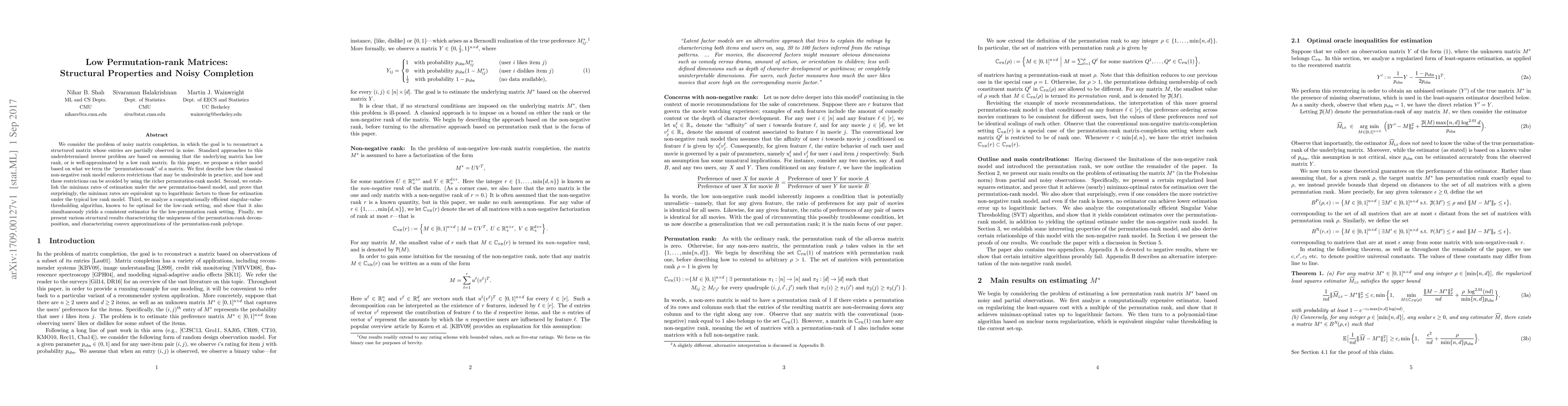 This paper introduces a "permutation-rank" model for noisy matrix completion, offering a richer alternative to the classical non-negative rank model. It establishes minimax estimation rates and proves the equivalence of these rates to those of the low-rank model, while also demonstrating the effectiveness of a singular-value-thresholding algorithm in this new setting.
