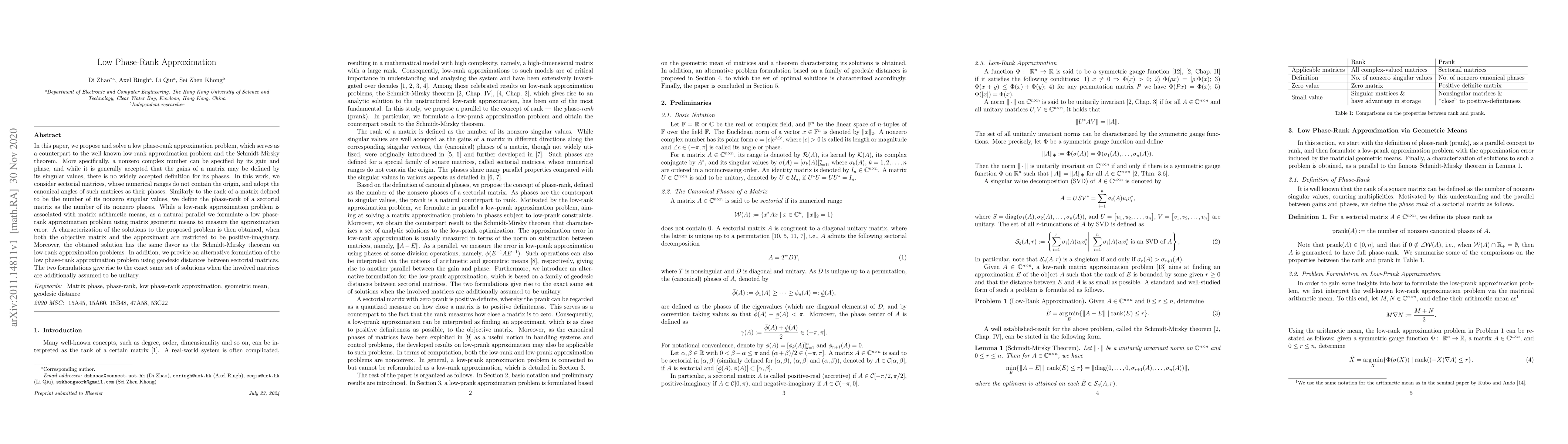 In this paper, we propose and solve a low phase-rank approximation problem, which serves as a counterpart to the well-known low-rank approximation problem and the Schmidt-Mirsky theorem. More specifically, a nonzero complex number can be specified by its gain and phase, and while it is generally accepted that the gains of a matrix may be defined by its singular values, there is no widely accepted definition for its phases. In this work, we consider sectorial matrices, whose numerical ranges do not contain the origin, and adopt the canonical angles of such matrices as their phases. Similarly to the rank of a matrix defined to be the number of its nonzero singular values, we define the phase-rank of a sectorial matrix as the number of its nonzero phases. While a low-rank approximation problem is associated with matrix arithmetic means, as a natural parallel we formulate a low phase-rank approximation problem using matrix geometric means to measure the approximation error. A characterization of the solutions to the proposed problem is then obtained, when both the objective matrix and the approximant are restricted to be positive-imaginary. Moreover, the obtained solution has the same flavor as the Schmidt-Mirsky theorem on low-rank approximation problems. In addition, we provide an alternative formulation of the low phase-rank approximation problem using geodesic distances between sectorial matrices. The two formulations give rise to the exact same set of solutions when the involved matrices are additionally assumed to be unitary.