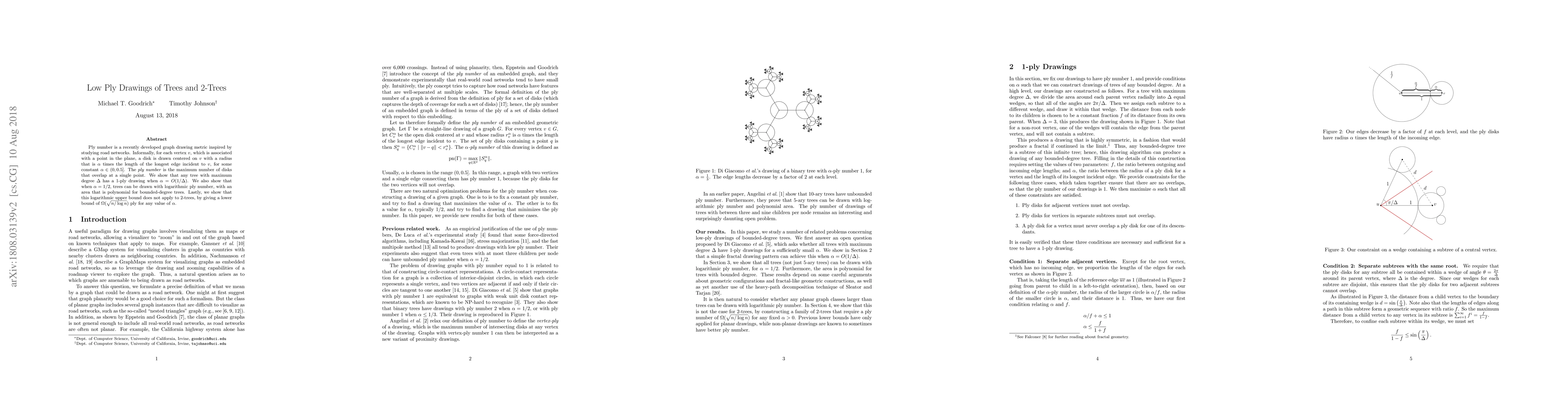 This paper explores low ply drawings for trees and 2-trees, introducing a new graph drawing metric based on disk overlaps. It demonstrates that trees can be drawn with a 1-ply configuration under certain conditions, while logarithmic ply drawings are feasible for bounded-degree trees. However, it establishes a lower bound for 2-trees, indicating they cannot achieve such low ply numbers.