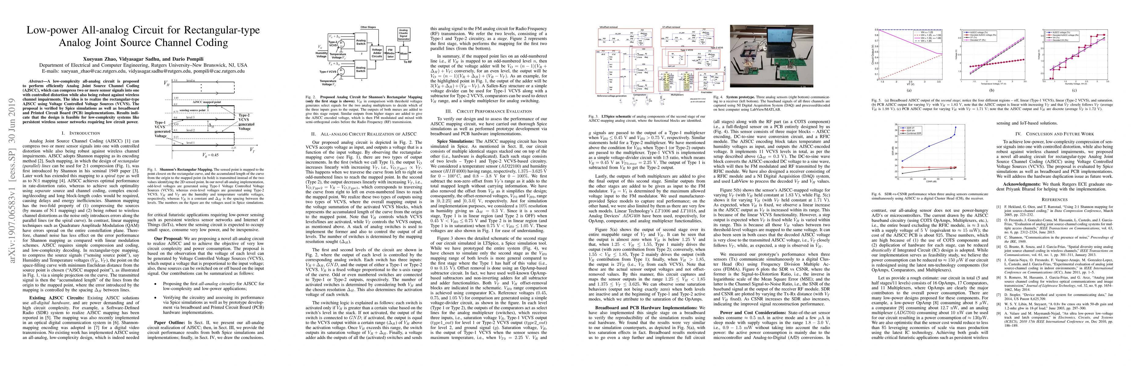 A low-complexity all-analog circuit is proposed to perform efficiently Analog Joint Source Channel Coding (AJSCC), which can compress two or more sensor signals into one with controlled distortion while also being robust against wireless channel impairments. The idea is to realize the rectangular-type AJSCC using Voltage Controlled Voltage Sources (VCVS). The proposal is verified by Spice simulations as well as breadboard and Printed Circuit Board (PCB) implementations. Results indicate that the design is feasible for low-complexity systems like persistent wireless sensor networks requiring low circuit power.