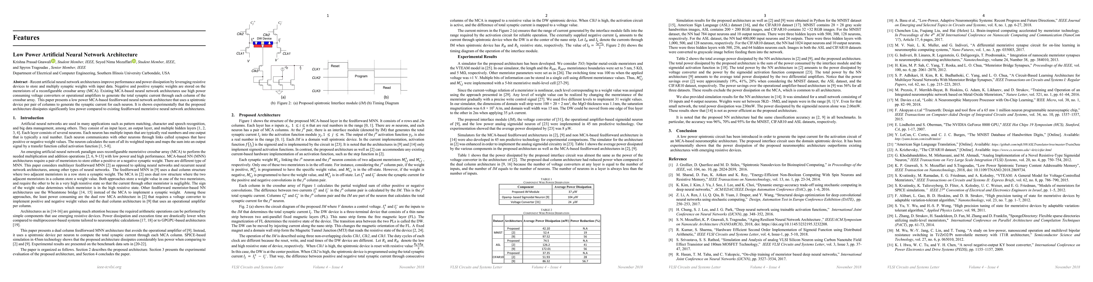 A low power artificial neural network architecture uses spintronic devices to reduce energy consumption compared to existing MCA-based architectures.