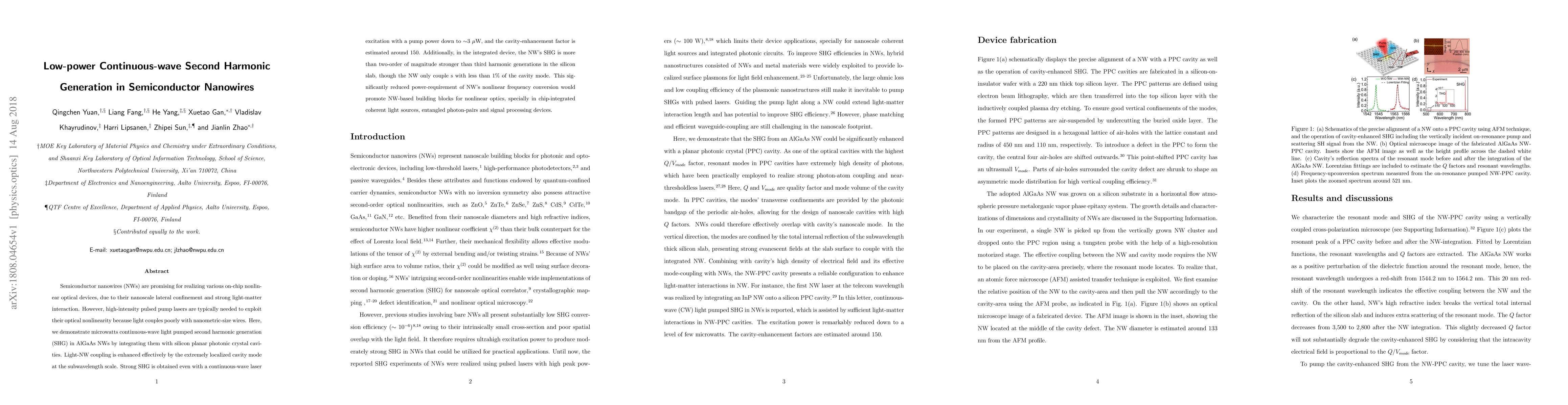 This paper demonstrates low-power continuous-wave second harmonic generation in AlGaAs semiconductor nanowires integrated with silicon photonic crystal cavities, achieving strong SHG with microwatts of pump power. The cavity enhances light-nanowire coupling, significantly reducing the power requirement for nonlinear optical processes.