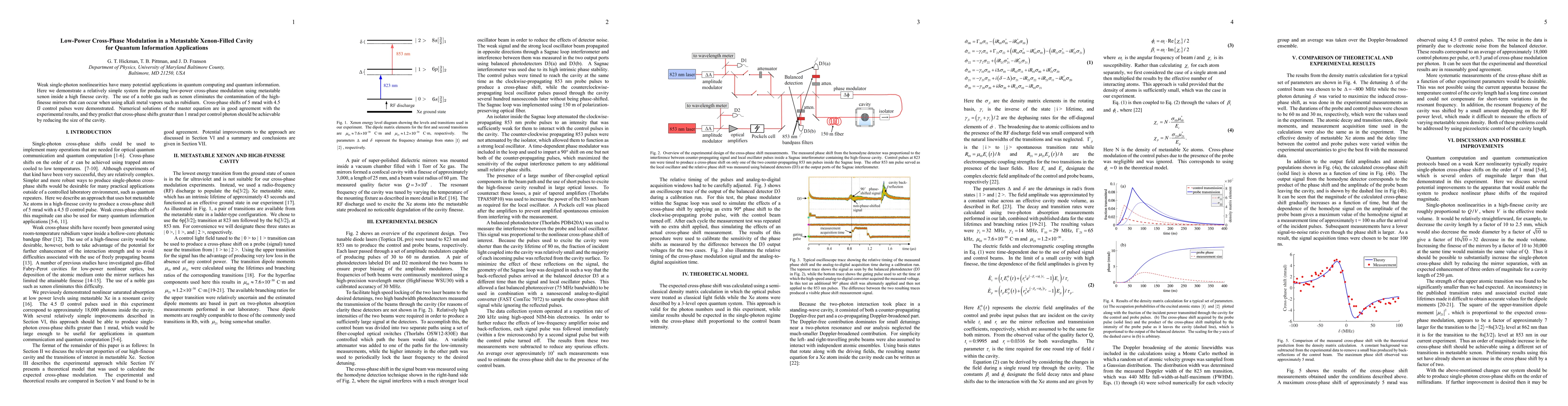 This paper demonstrates a low-power cross-phase modulation system using metastable xenon in a high finesse cavity, showing potential for quantum information applications. The use of xenon avoids mirror contamination issues, achieving cross-phase shifts of 5 mrad with 4.5 fJ control pulses, and simulations suggest even greater shifts with smaller cavities.
