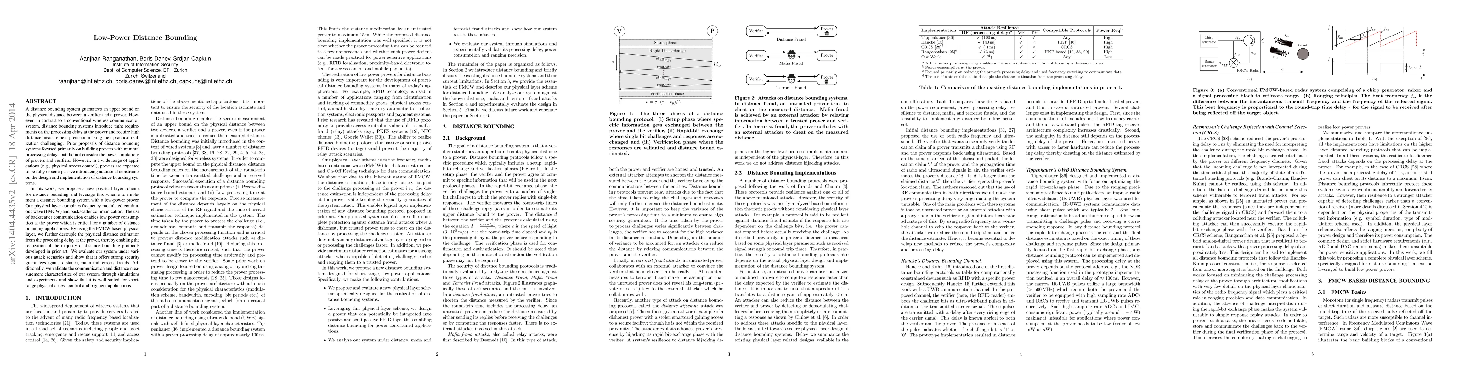 A distance bounding system guarantees an upper bound on the physical distance between a verifier and a prover. However, in contrast to a conventional wireless communication system, distance bounding systems introduce tight requirements on the processing delay at the prover and require high distance measurement precision making their practical realization challenging. Prior proposals of distance bounding systems focused primarily on building provers with minimal processing delays but did not consider the power limitations of provers and verifiers. However, in a wide range of applications (e.g., physical access control), provers are expected to be fully or semi-passive introducing additional constraints on the design and implementation of distance bounding systems. In this work, we propose a new physical layer scheme for distance bounding and leverage this scheme to implement a distance bounding system with a low-power prover. Our physical layer combines frequency modulated continuous wave (FMCW) and backscatter communication. The use of backscatter communication enables low power consumption at the prover which is critical for a number of distance bounding applications. By using the FMCW-based physical layer, we further decouple the physical distance estimation from the processing delay at the prover, thereby enabling the realization of the majority of distance bounding protocols developed in prior art. We evaluate our system under various attack scenarios and show that it offers strong security guarantees against distance, mafia and terrorist frauds. Additionally, we validate the communication and distance measurement characteristics of our system through simulations and experiments and show that it is well suited for short-range physical access control and payment applications.