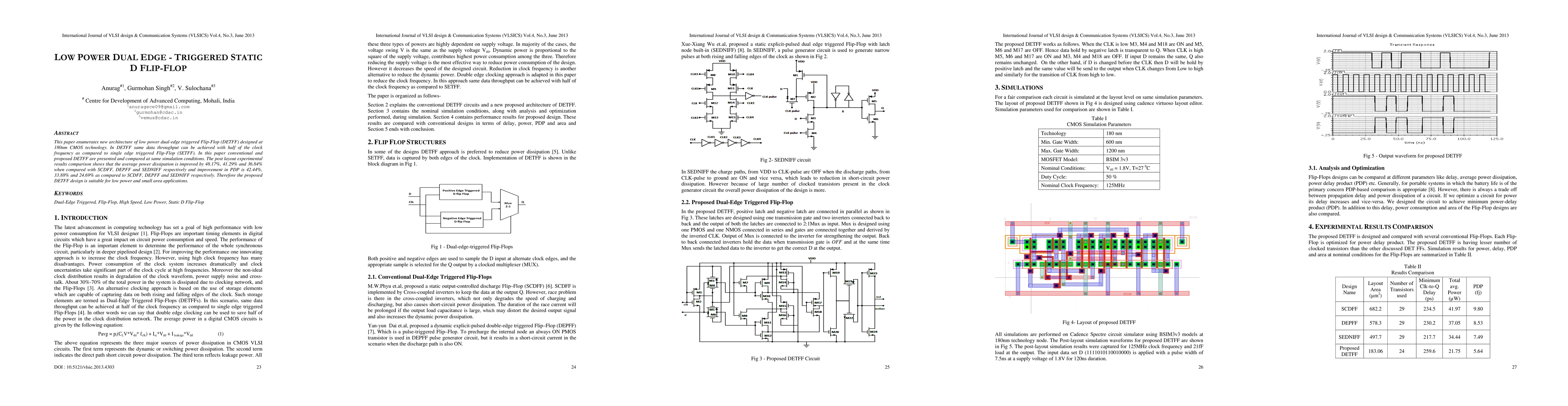 This paper enumerates new architecture of low power dual-edge triggered Flip-Flop (DETFF) designed at 180nm CMOS technology. In DETFF same data throughput can be achieved with half of the clock frequency as compared to single edge triggered Flip-Flop (SETFF). In this paper conventional and proposed DETFF are presented and compared at same simulation conditions. The post layout experimental results comparison shows that the average power dissipation is improved by 48.17%, 41.29% and 36.84% when compared with SCDFF, DEPFF and SEDNIFF respectively and improvement in PDP is 42.44%, 33.88% and 24.69% as compared to SCDFF, DEPFF and SEDNIFF respectively. Therefore the proposed DETFF design is suitable for low power and small area applications.