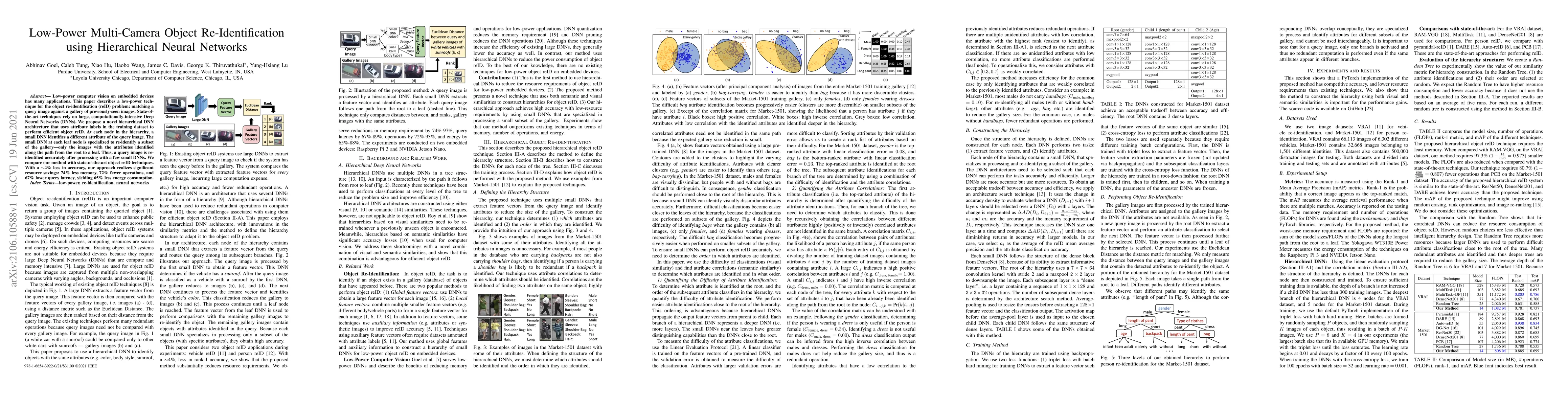Low-power computer vision on embedded devices has many applications. This paper describes a low-power technique for the object re-identification (reID) problem: matching a query image against a gallery of previously seen images. State-of-the-art techniques rely on large, computationally-intensive Deep Neural Networks (DNNs). We propose a novel hierarchical DNN architecture that uses attribute labels in the training dataset to perform efficient object reID. At each node in the hierarchy, a small DNN identifies a different attribute of the query image. The small DNN at each leaf node is specialized to re-identify a subset of the gallery: only the images with the attributes identified along the path from the root to a leaf. Thus, a query image is re-identified accurately after processing with a few small DNNs. We compare our method with state-of-the-art object reID techniques. With a 4% loss in accuracy, our approach realizes significant resource savings: 74% less memory, 72% fewer operations, and 67% lower query latency, yielding 65% less energy consumption.