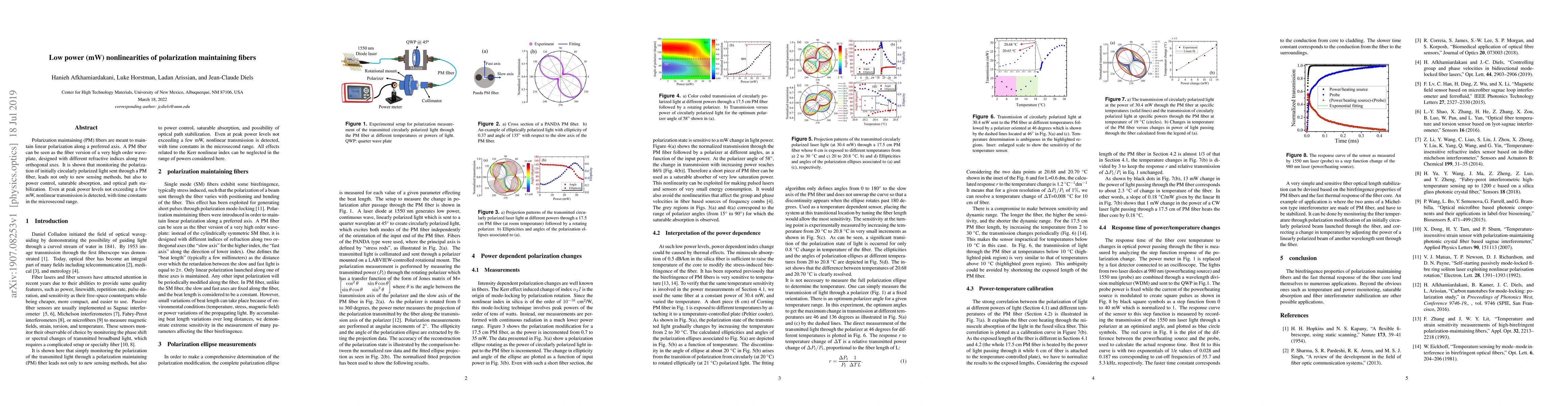 This paper explores the low power nonlinearities in polarization maintaining fibers, revealing that they can exhibit nonlinear transmission at peak power levels of a few mW, leading to applications in sensing, power control, saturable absorption, and optical path stabilization. The detected nonlinear effects occur with microsecond time constants.