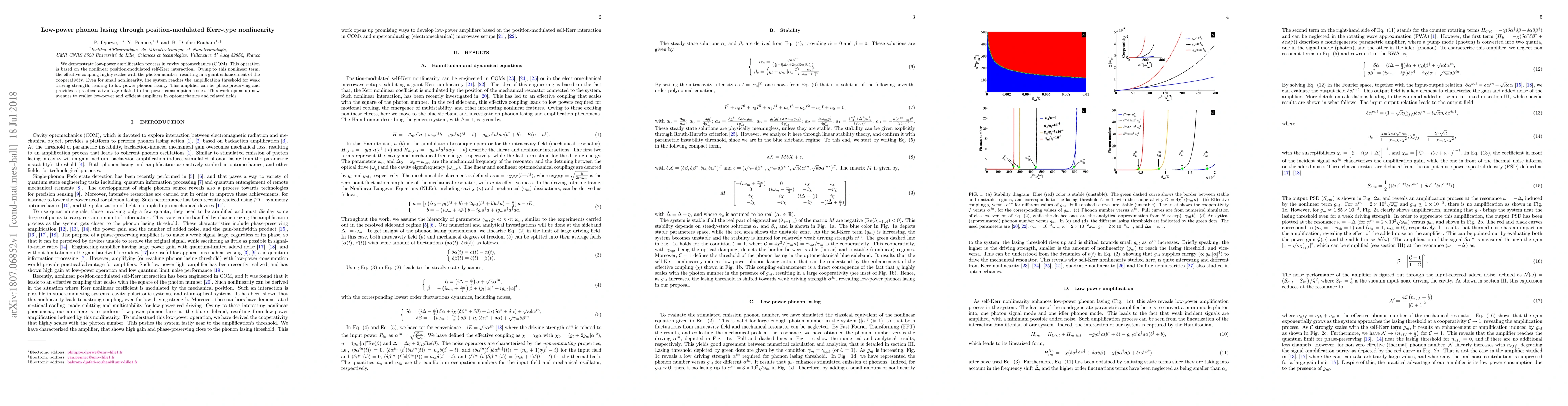This paper demonstrates low-power phonon amplification in cavity optomechanics via a nonlinear position-modulated self-Kerr interaction, achieving significant cooperativity enhancement and enabling low-power phonon lasing with phase-preserving advantages. This innovation offers practical solutions for power-efficient amplifiers in optomechanics.