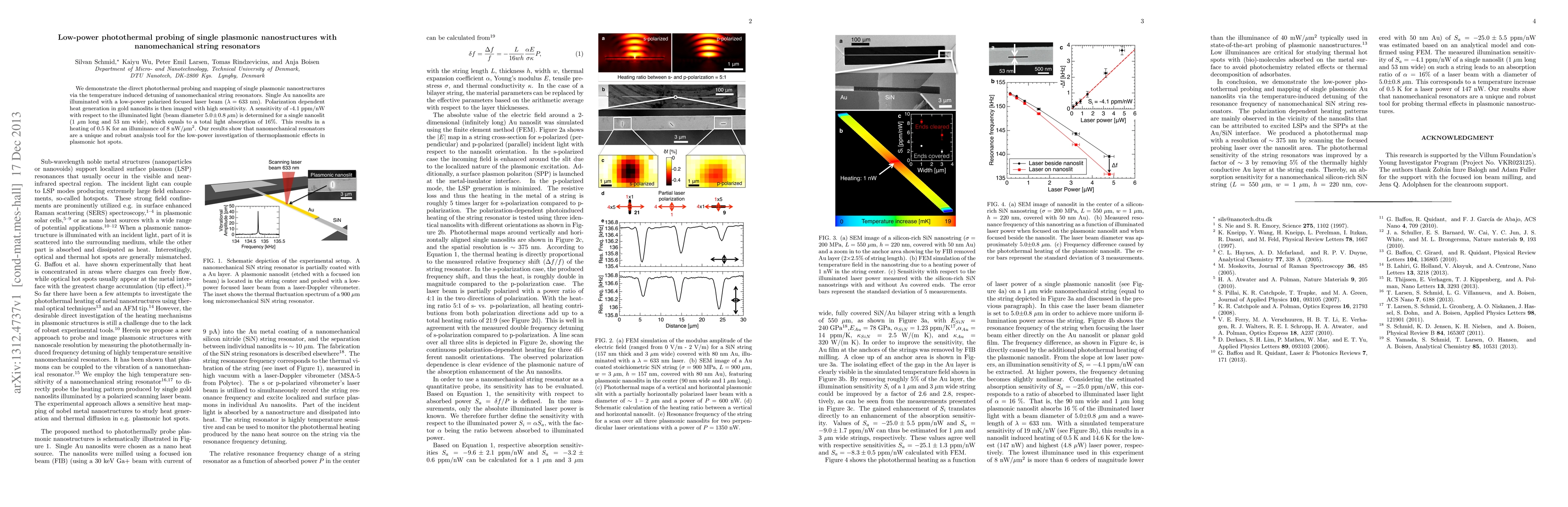 This research demonstrates the use of nanomechanical string resonators to directly probe and map the thermoplasmonic effects in single plasmonic nanoslits with low-power laser illumination. The study achieves a sensitivity of 4.1 ppm/nW, revealing a heating of 0.5 K from an illuminance of 8 nW/μm², indicating the effectiveness of nanomechanical resonators for low-power thermoplasmonic analysis.