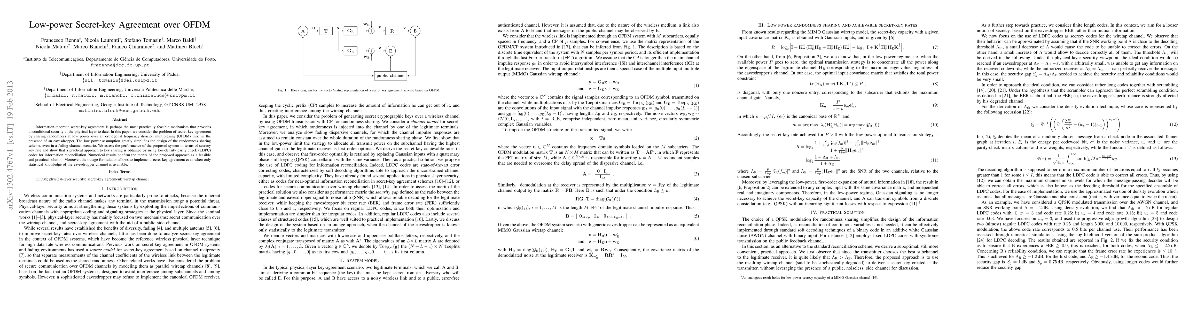 This paper presents a low-power secret-key agreement mechanism over OFDM channels, focusing on unconditional security through information-theoretic means. It employs low-density parity check codes for practical key sharing, demonstrating feasibility and performance in terms of secrecy key rate and outage scenarios.