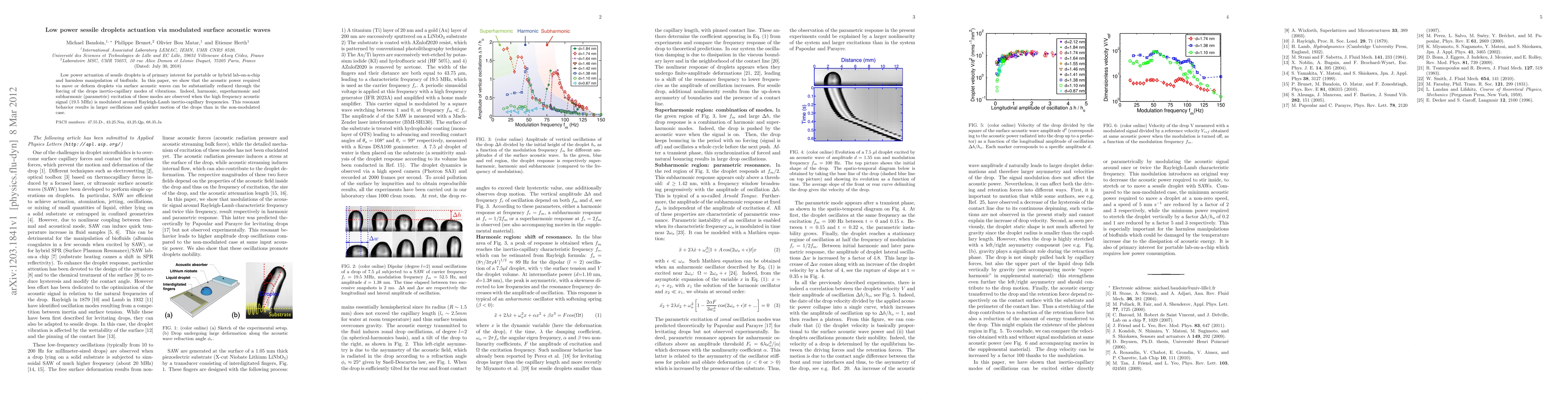 Low power actuation of sessile droplets is of primary interest for portable or hybrid lab-on-a-chip and harmless manipulation of biofluids. In this paper, we show that the acoustic power required to move or deform droplets via surface acoustic waves can be substantially reduced through the forcing of the drops inertio-capillary modes of vibrations. Indeed, harmonic, superharmonic and subharmonic (parametric) excitation of these modes are observed when the high frequency acoustic signal (19.5 MHz) is modulated around Rayleigh-Lamb inertio-capillary frequencies. This resonant behavior results in larger oscillations and quicker motion of the drops than in the non-modulated case.
