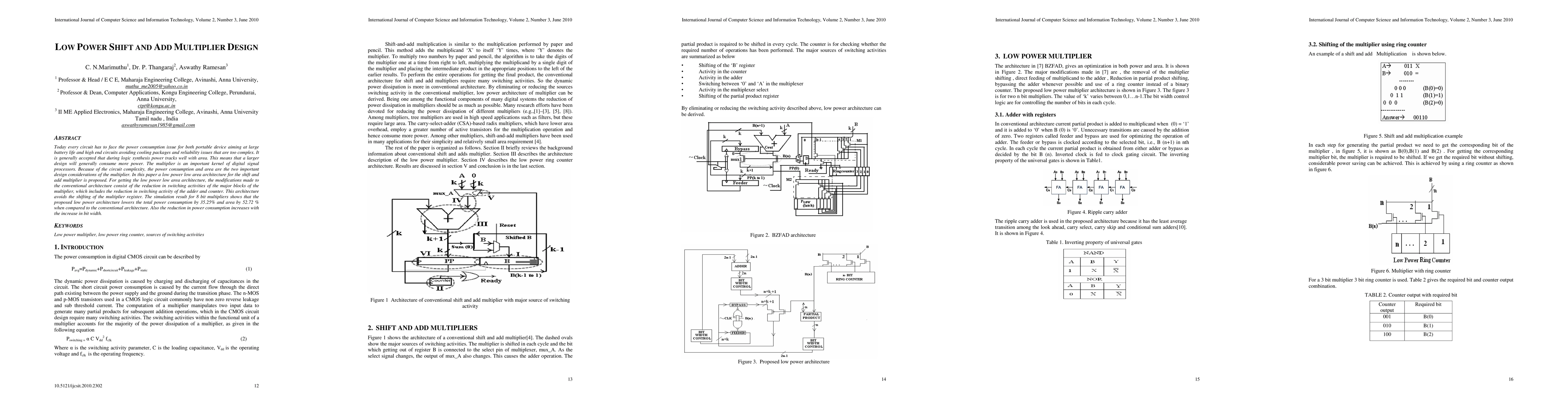 This paper proposes a low power, low area architecture for shift and add multipliers, achieving a 35.25% reduction in power consumption and a 52.72% reduction in area compared to conventional designs, by minimizing switching activities in key blocks and avoiding the shifting of the multiplier register.