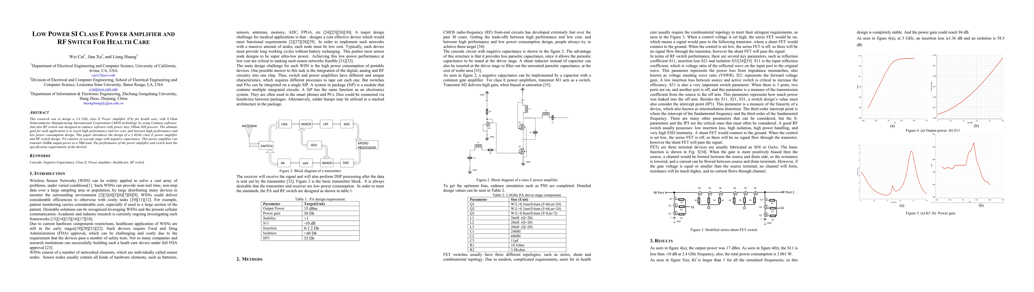 This paper presents a low-power 2.4 GHz class E power amplifier and RF switch designed for healthcare applications using 0.18um CMOS technology, achieving 16dBm output power and meeting performance specifications. The design balances high performance with low power consumption and low cost.