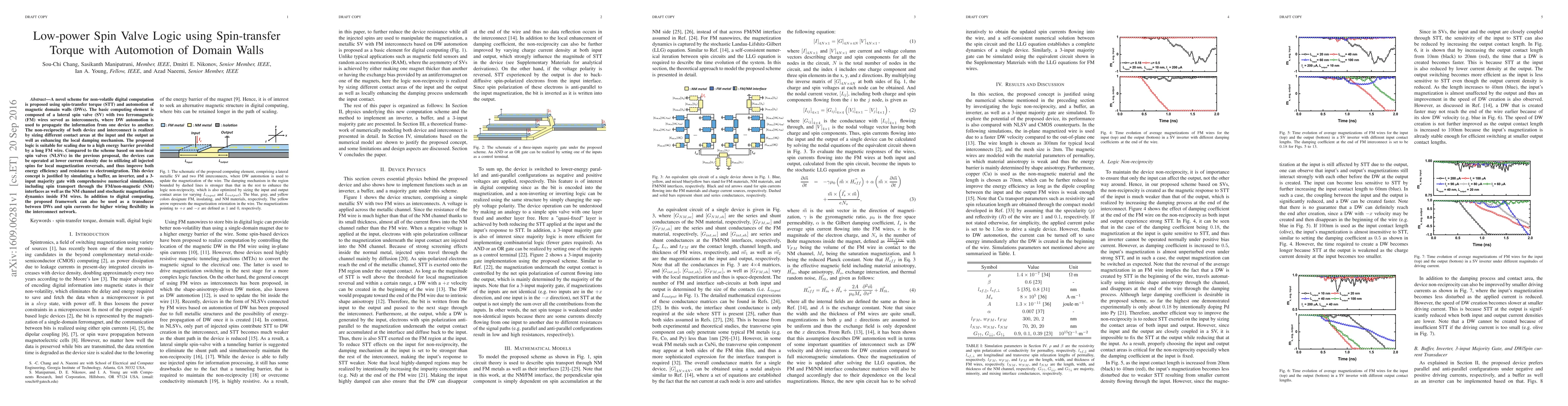 This paper proposes a low-power spin valve logic using spin-transfer torque and domain wall automotion for non-volatile digital computation. The scheme utilizes lateral spin valves with ferromagnetic wires to propagate information efficiently, offering improved energy efficiency and resistance to electromigration compared to previous non-local spin valve schemes.
