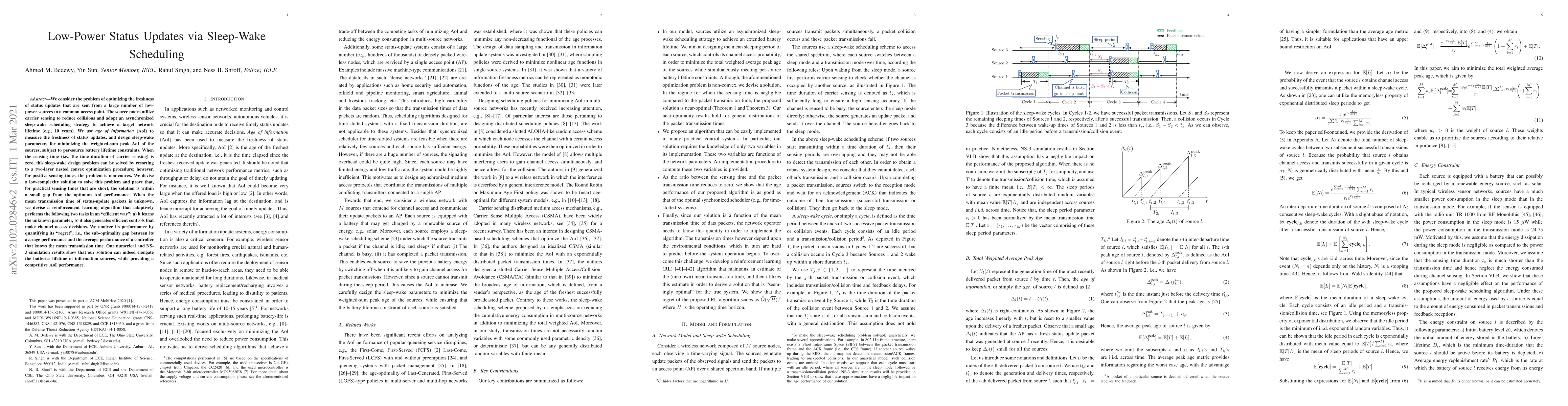 We consider the problem of optimizing the freshness of status updates that are sent from a large number of low-power sources to a common access point. The source nodes utilize carrier sensing to reduce collisions and adopt an asynchronized sleep-wake scheduling strategy to achieve a target network lifetime (e.g., 10 years). We use age of information (AoI) to measure the freshness of status updates, and design sleep-wake parameters for minimizing the weighted-sum peak AoI of the sources, subject to per-source battery lifetime constraints. When the sensing time (i.e., the time duration of carrier sensing) is zero, this sleep-wake design problem can be solved by resorting to a two-layer nested convex optimization procedure; however, for positive sensing times, the problem is non-convex. We devise a low-complexity solution to solve this problem and prove that, for practical sensing times that are short, the solution is within a small gap from the optimum AoI performance. When the mean transmission time of status-update packets is unknown, we devise a reinforcement learning algorithm that adaptively performs the following two tasks in an ``efficient way'': a) it learns the unknown parameter, b) it also generates efficient controls that make channel access decisions. We analyze its performance by quantifying its ``regret'', i.e., the sub-optimality gap between its average performance and the average performance of a controller that knows the mean transmission time. Our numerical and NS-3 simulation results show that our solution can indeed elongate the batteries lifetime of information sources, while providing a competitive AoI performance.