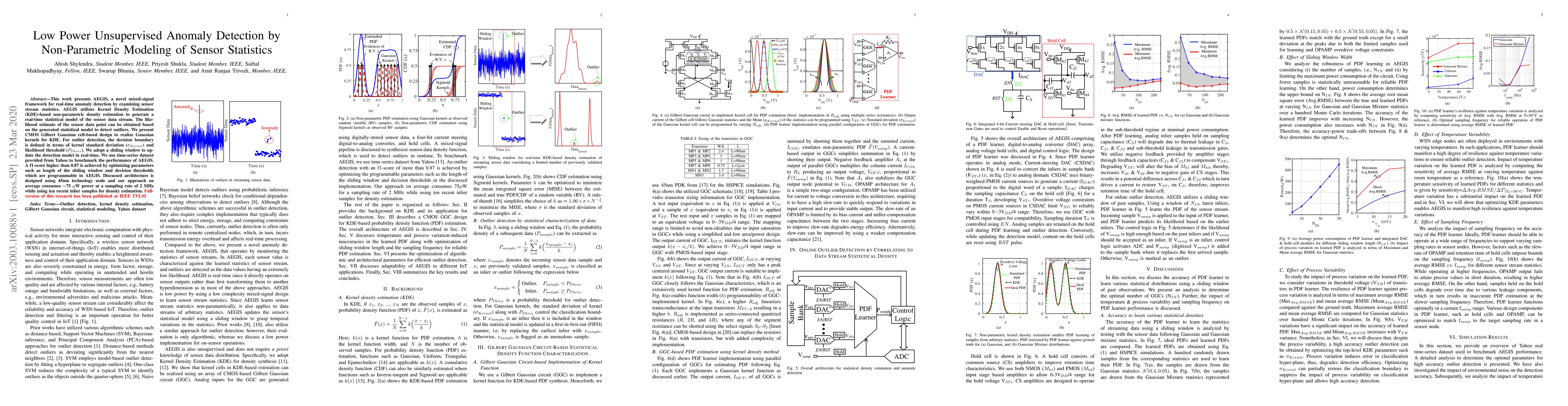 This work presents AEGIS, a novel mixed-signal framework for real-time anomaly detection by examining sensor stream statistics. AEGIS utilizes Kernel Density Estimation (KDE)-based non-parametric density estimation to generate a real-time statistical model of the sensor data stream. The likelihood estimate of the sensor data point can be obtained based on the generated statistical model to detect outliers. We present CMOS Gilbert Gaussian cell-based design to realize Gaussian kernels for KDE. For outlier detection, the decision boundary is defined in terms of kernel standard deviation ($\sigma_{Kernel}$) and likelihood threshold ($P_{Thres}$). We adopt a sliding window to update the detection model in real-time. We use time-series dataset provided from Yahoo to benchmark the performance of AEGIS. A f1-score higher than 0.87 is achieved by optimizing parameters such as length of the sliding window and decision thresholds which are programmable in AEGIS. Discussed architecture is designed using 45nm technology node and our approach on average consumes $\sim$75 $\mu$W power at a sampling rate of 2 MHz while using ten recent inlier samples for density estimation. \textcolor{red}{Full-version of this research has been published at IEEE TVLSI}