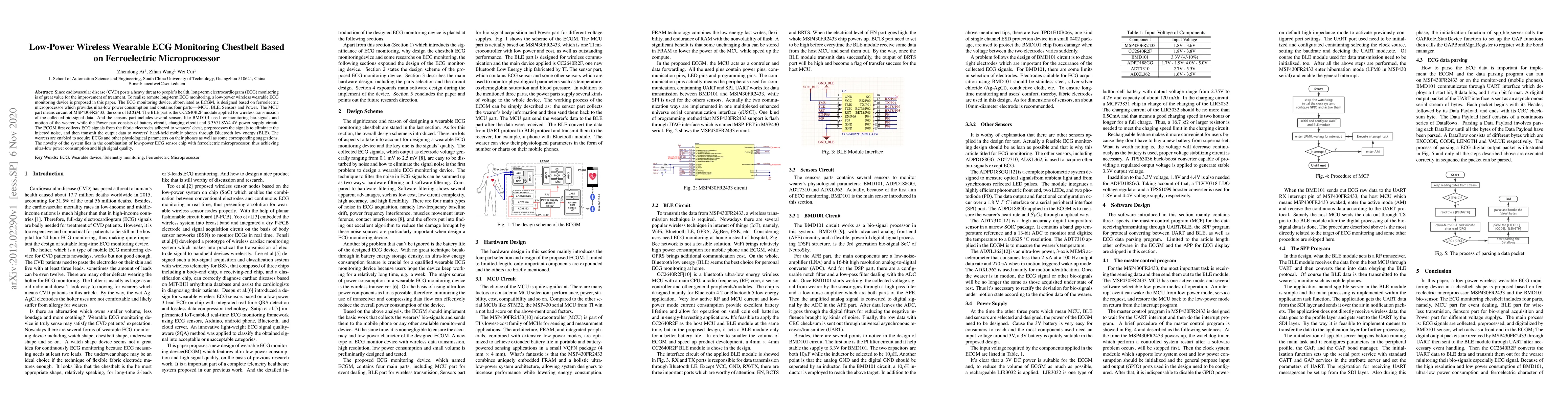This paper proposes a low-power wireless wearable ECG monitoring chestbelt based on a ferroelectric microprocessor, which combines ultra-low power consumption with high-quality ECG signal acquisition and transmission via Bluetooth low energy to a mobile phone for real-time monitoring and suggestions.