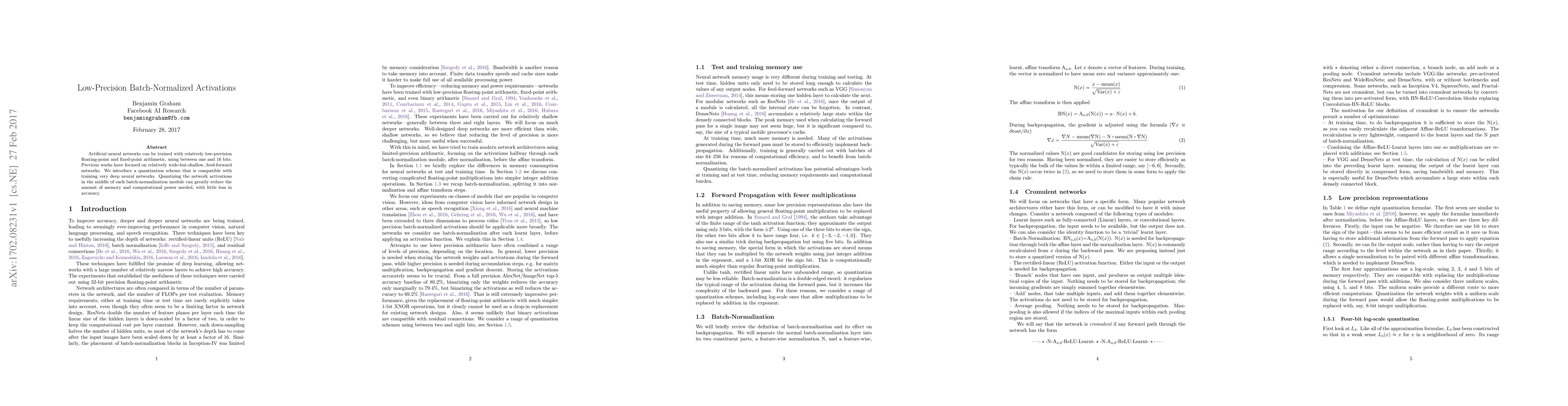 Artificial neural networks can be trained with relatively low-precision floating-point and fixed-point arithmetic, using between one and 16 bits. Previous works have focused on relatively wide-but-shallow, feed-forward networks. We introduce a quantization scheme that is compatible with training very deep neural networks. Quantizing the network activations in the middle of each batch-normalization module can greatly reduce the amount of memory and computational power needed, with little loss in accuracy.