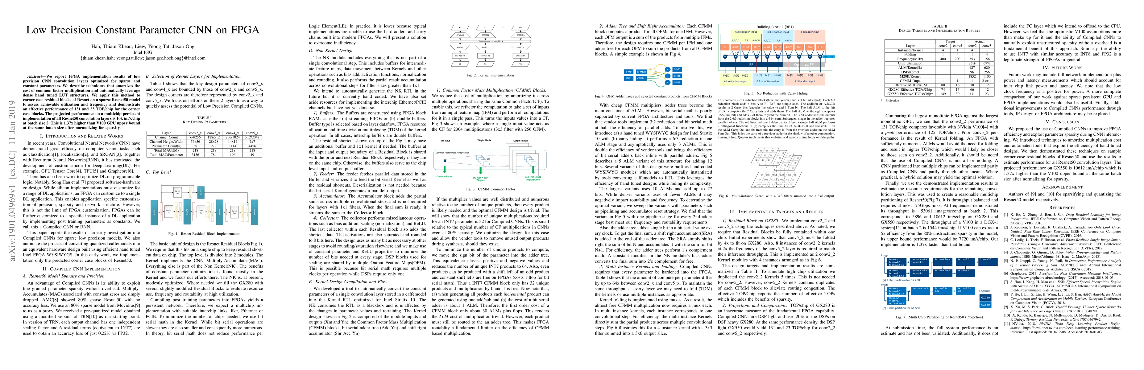 We report FPGA implementation results of low precision CNN convolution layers optimized for sparse and constant parameters. We describe techniques that amortizes the cost of common factor multiplication and automatically leverage dense hand tuned LUT structures. We apply this method to corner case residual blocks of Resnet on a sparse Resnet50 model to assess achievable utilization and frequency and demonstrate an effective performance of 131 and 23 TOP/chip for the corner case blocks. The projected performance on a multichip persistent implementation of all Resnet50 convolution layers is 10k im/s/chip at batch size 2. This is 1.37x higher than V100 GPU upper bound at the same batch size after normalizing for sparsity.