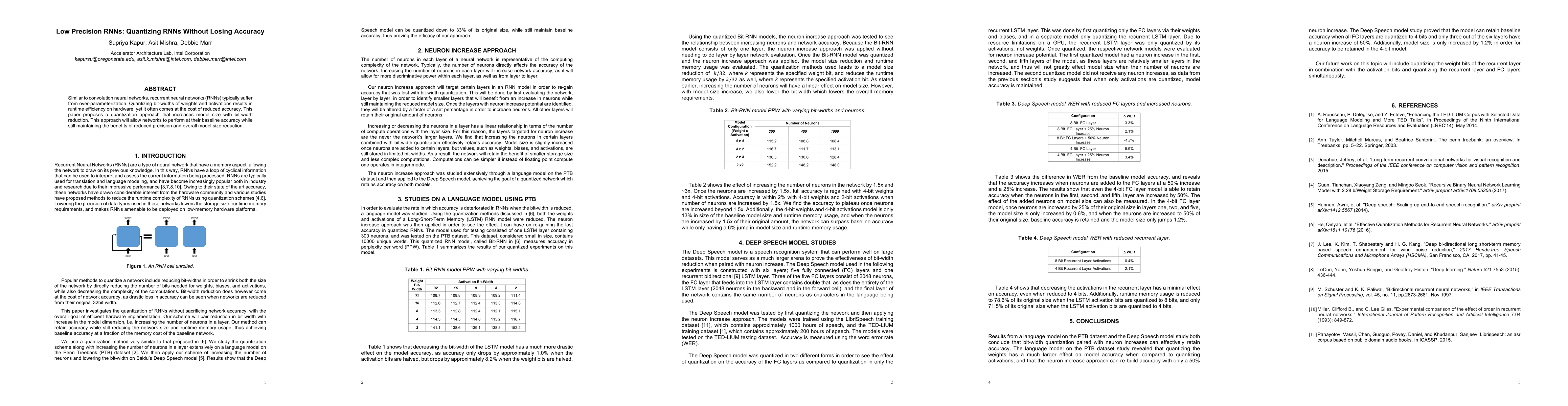 Similar to convolution neural networks, recurrent neural networks (RNNs) typically suffer from over-parameterization. Quantizing bit-widths of weights and activations results in runtime efficiency on hardware, yet it often comes at the cost of reduced accuracy. This paper proposes a quantization approach that increases model size with bit-width reduction. This approach will allow networks to perform at their baseline accuracy while still maintaining the benefits of reduced precision and overall model size reduction.