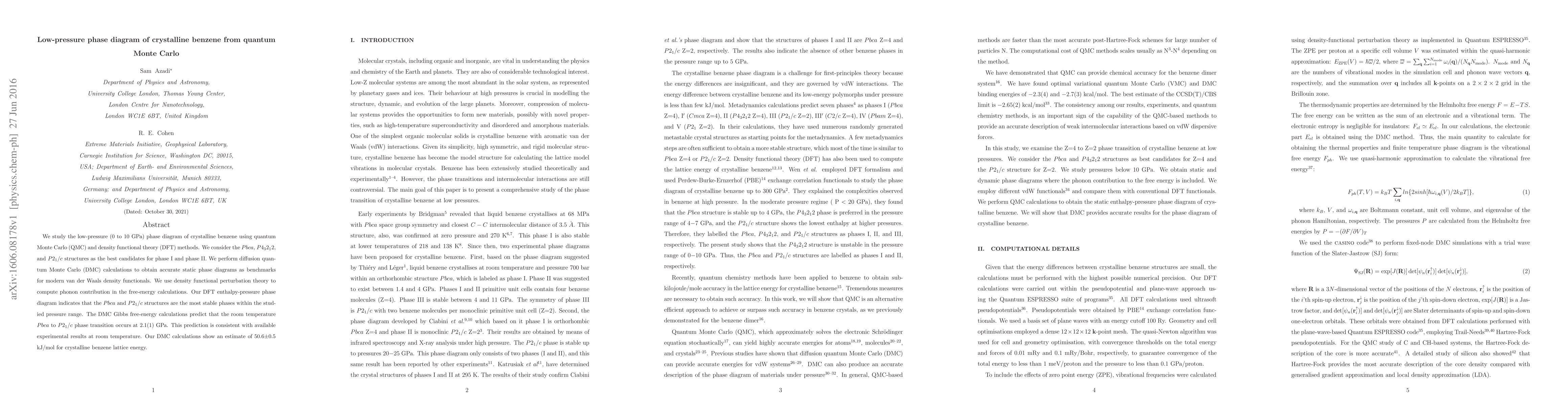 This study uses quantum Monte Carlo and density functional theory to map the low-pressure phase diagram of crystalline benzene, identifying $Pbca$ and $P2_1/c$ as the most stable phases. The predicted $Pbca$ to $P2_1/c$ phase transition at 2.1(1) GPa aligns with experimental data.