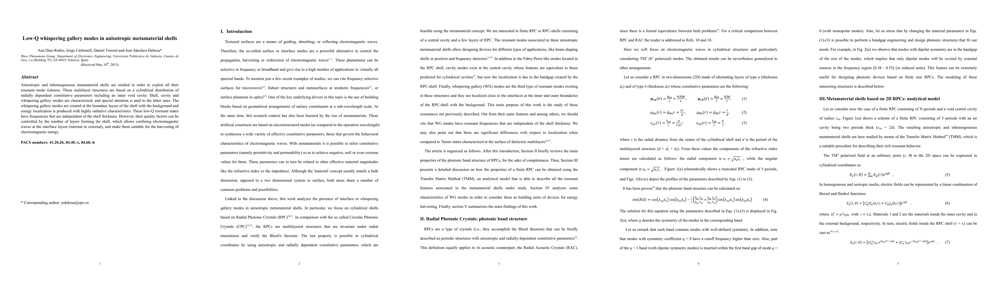 This paper investigates anisotropic metamaterial shells with radially dependent constitutive parameters, focusing on their low-Q whispering gallery modes. These modes, localized at the shell boundary, enable efficient electromagnetic wave confinement and energy harvesting, with quality factors tunable by the number of shell layers.
