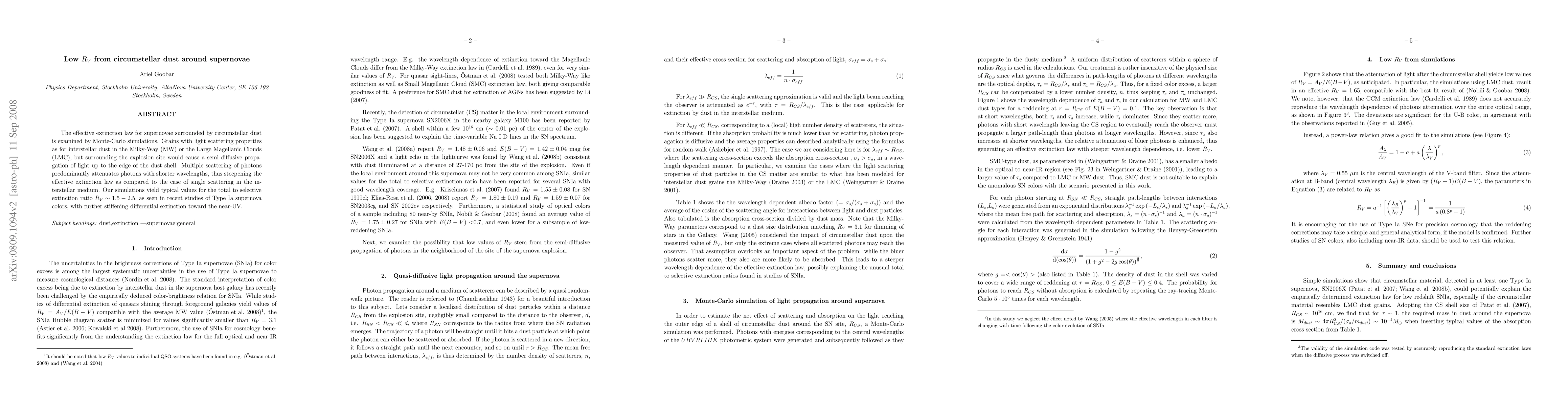 The effective extinction law for supernovae surrounded by circumstellar dust is examined by Monte-Carlo simulations. Grains with light scattering properties as for interstellar dust in the Milky-Way (MW) or the Large Magellanic Clouds (LMC), but surrounding the explosion site would cause a semi-diffusive propagation of light up to the edge of the dust shell. Multiple scattering of photons predominantly attenuates photons with shorter wavelengths, thus steepening the effective extinction law as compared to the case of single scattering in the interstellar medium. Our simulations yield typical values for the total to selective extinction ratio $R_V\sim 1.5-2.5$, as seen in recent studies of Type Ia supernova colors, with further stiffening differential extinction toward the near-UV.