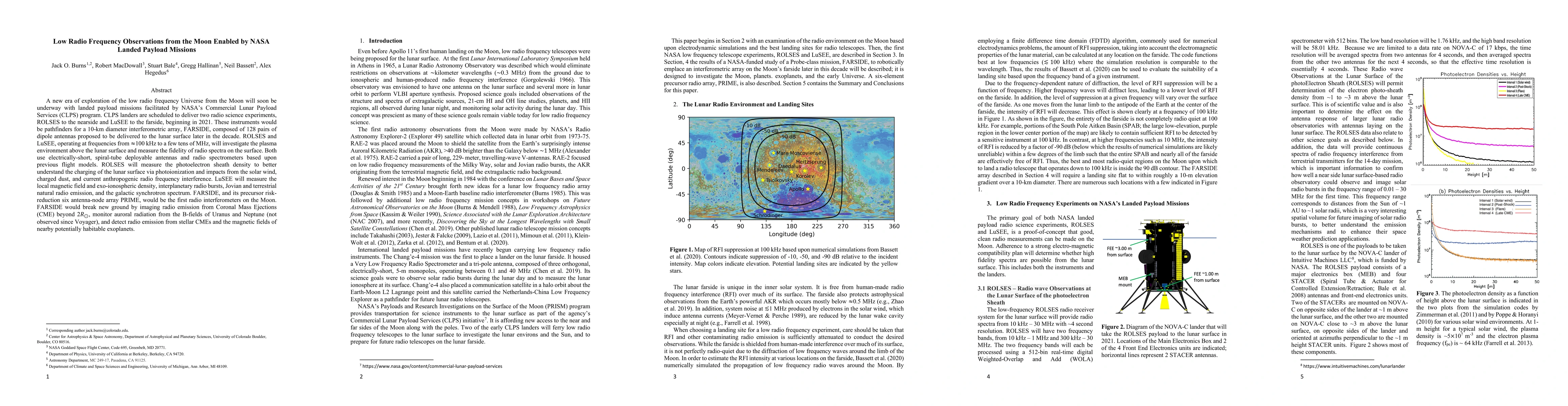 A new era of exploration of the low radio frequency Universe from the Moon will soon be underway with landed payload missions facilitated by NASA's Commercial Lunar Payload Services (CLPS) program. CLPS landers are scheduled to deliver two radio science experiments, ROLSES to the nearside and LuSEE to the farside, beginning in 2021. These instruments would be pathfinders for a 10-km diameter interferometric array, FARSIDE, composed of 128 pairs of dipole antennas proposed to be delivered to the lunar surface later in the decade. ROLSES and LuSEE, operating at frequencies from 100 kHz to a few tens of MHz, will investigate the plasma environment above the lunar surface and measure the fidelity of radio spectra on the surface. Both use electrically-short, spiral-tube deployable antennas and radio spectrometers based upon previous flight models. ROLSES will measure the photoelectron sheath density to better understand the charging of the lunar surface via photoionization and impacts from the solar wind, charged dust, and current anthropogenic radio frequency interference. LuSEE will measure the local magnetic field and exo-ionospheric density, interplanetary radio bursts, Jovian and terrestrial natural radio emission, and the galactic synchrotron spectrum. FARSIDE, and its precursor risk-reduction six antenna-node array PRIME, would be the first radio interferometers on the Moon. FARSIDE would break new ground by imaging radio emission from Coronal Mass Ejections (CME) beyond 2 solar radii, monitor auroral radiation from the B-fields of Uranus and Neptune (not observed since Voyager), and detect radio emission from stellar CMEs and the magnetic fields of nearby potentially habitable exoplanets.