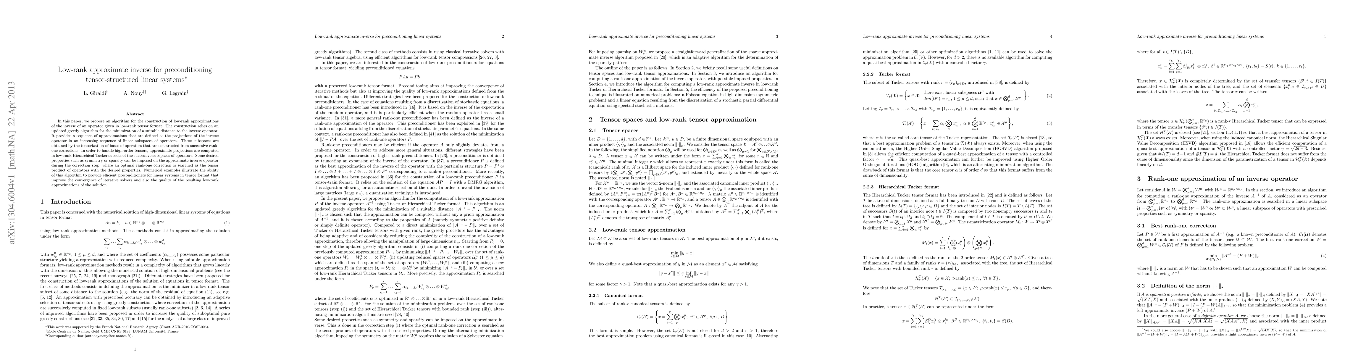 This paper proposes an algorithm for constructing low-rank approximations of an inverse operator in tensor format, using a greedy method to minimize distance to the inverse. It demonstrates efficient preconditioning for tensor-structured linear systems, improving iterative solver convergence and solution approximation quality.