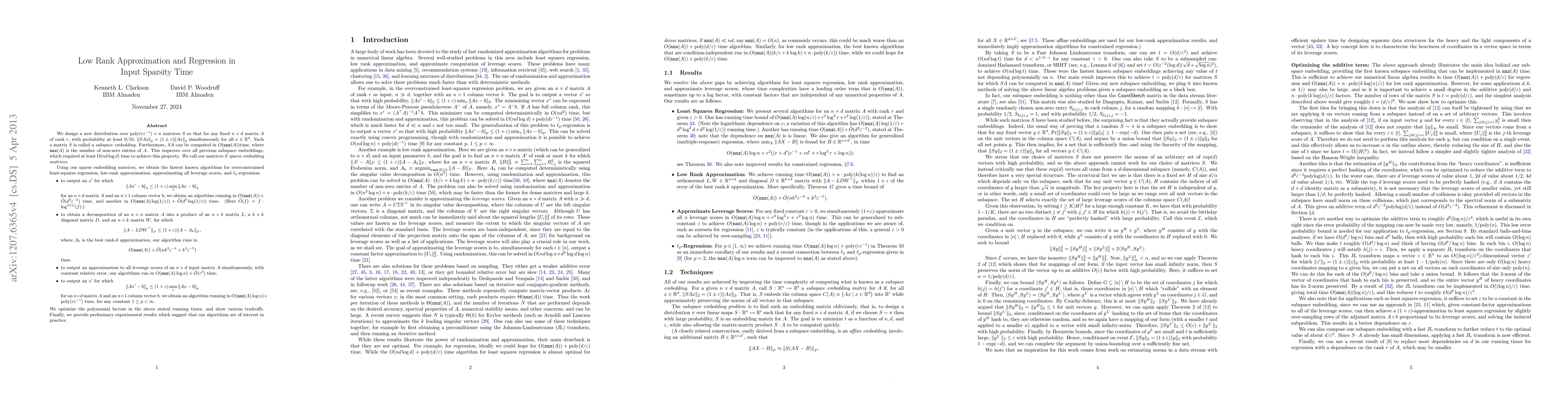 This paper introduces a new type of sparse embedding matrix that efficiently approximates the action of any low-rank matrix in input sparsity time, significantly improving previous methods. The proposed algorithms achieve optimal time complexity for various regression and approximation tasks, demonstrating practical competitiveness.