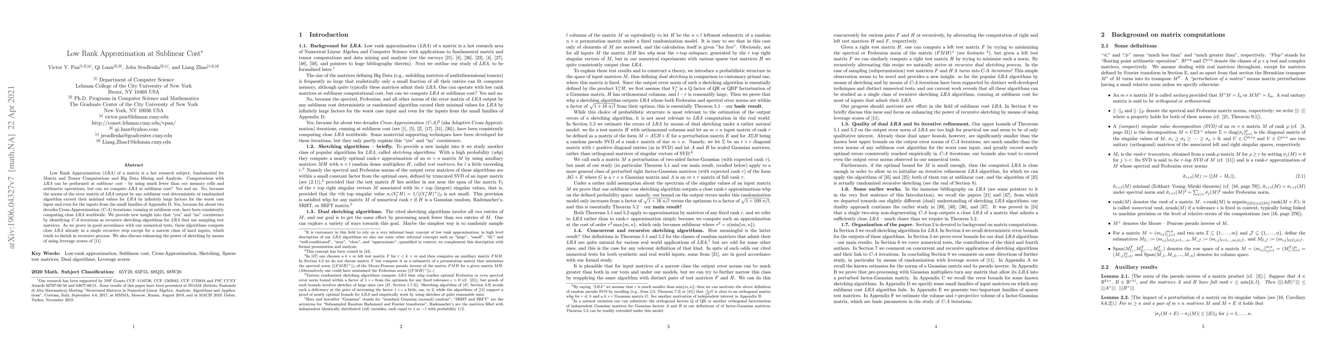 This paper explores the feasibility of computing Low Rank Approximation (LRA) at sublinear cost, revealing a paradox: while no sublinear cost algorithm can achieve optimal LRA for all inputs, Cross-Approximation (C-A) iterations, a form of recursive sketching, consistently provide close approximations at sublinear cost, especially when leveraging leverage scores.