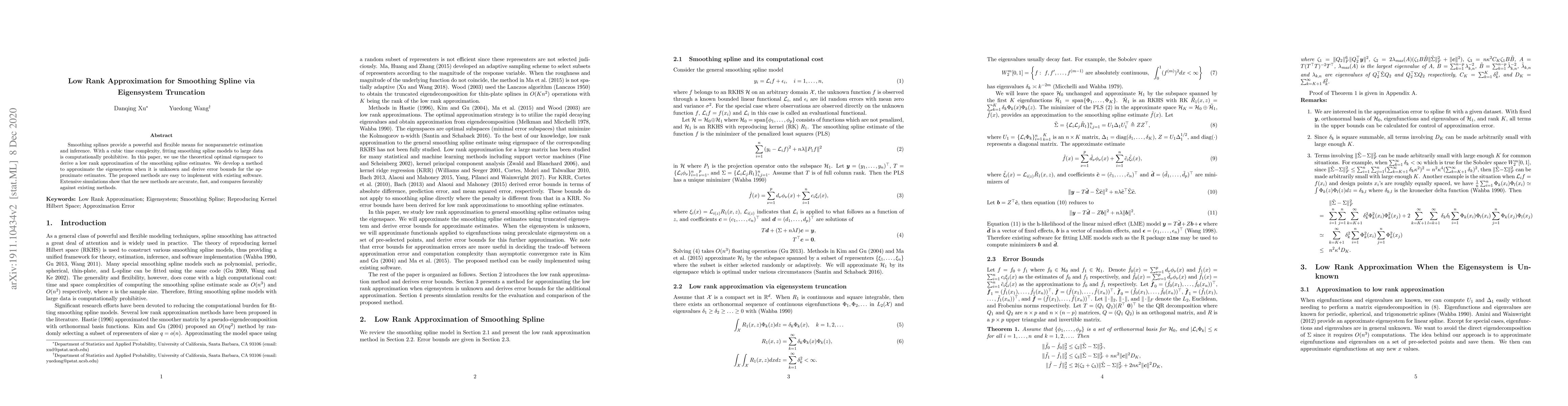 This paper presents a low rank approximation method for smoothing splines using eigensystem truncation, which is computationally efficient for large datasets. The authors develop an approach to approximate the eigensystem and provide error bounds, demonstrating accuracy and speed through extensive simulations.